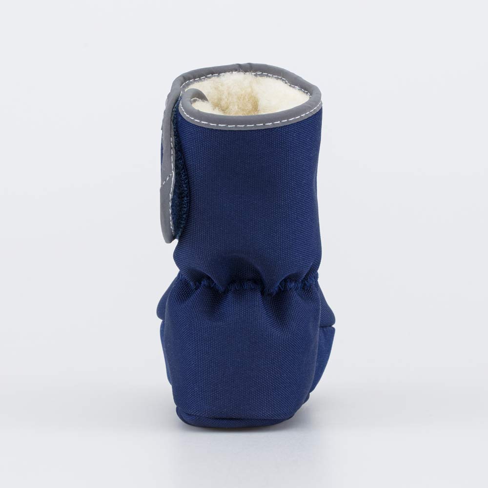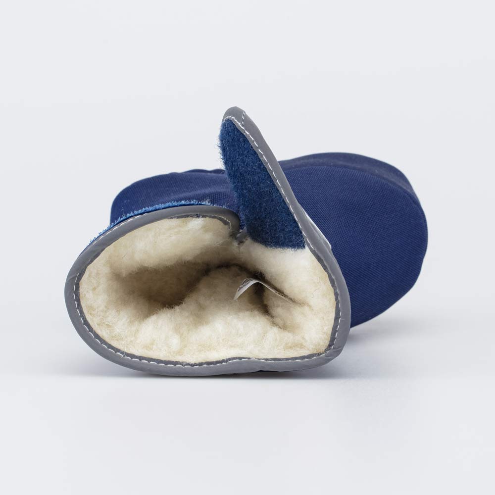 Синие пинетки на меху выполнены из мягкой влагоотталкивающей и непродуваемой болоньевой ткани. Шерстяной мех из натуральной овечьей шерсти в качестве подкладки обеспечивает здоровый микроклимат вокруг ножек и надежно сохраняет тепло.
