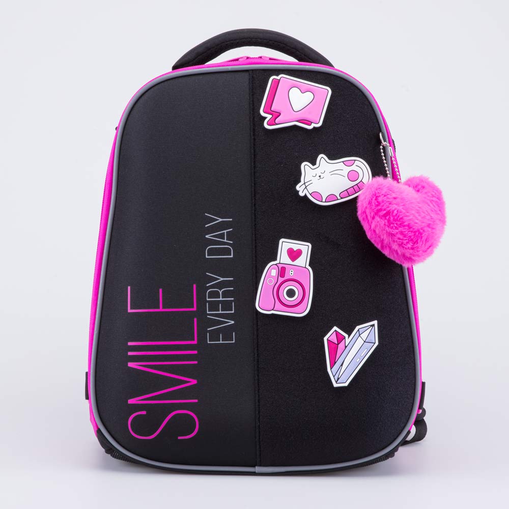 Каркасный рюкзак с анатомической спинкой оснащен системой регулировки по росту. Имеет два отделения для учебных пособий формата А4, органайзер с карабином для ключа, один сетчатый кармашек внутри и два внешних боковых кармана.