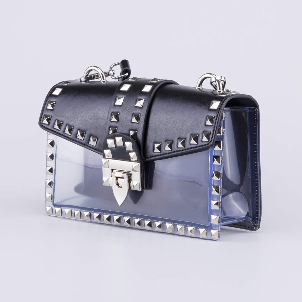 Модель украшена металлическими клепками и имеет прозрачную лицевую сторону из ПВХ, остальная часть выполнена из искусственной кожи, что создает смелую игру контрастов.