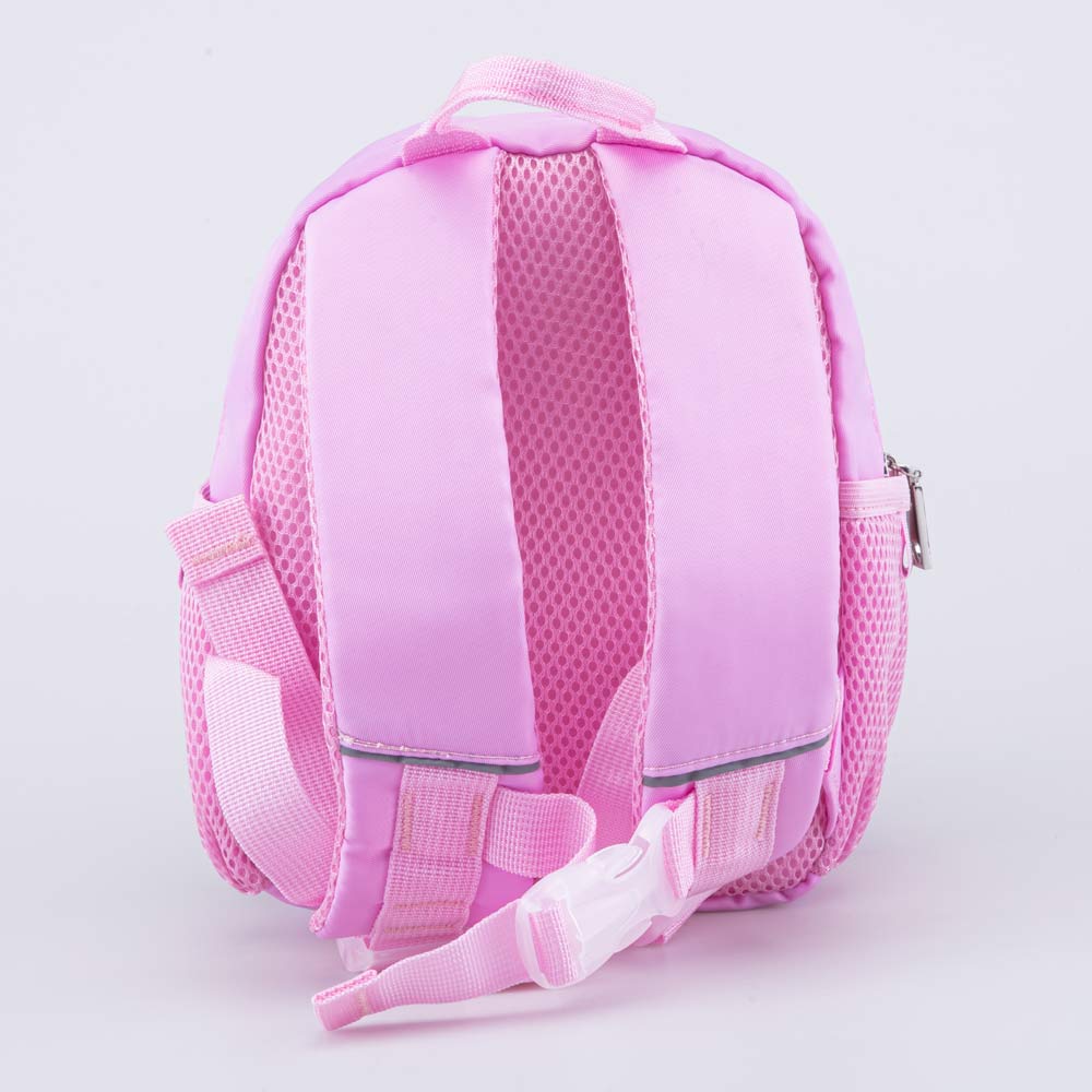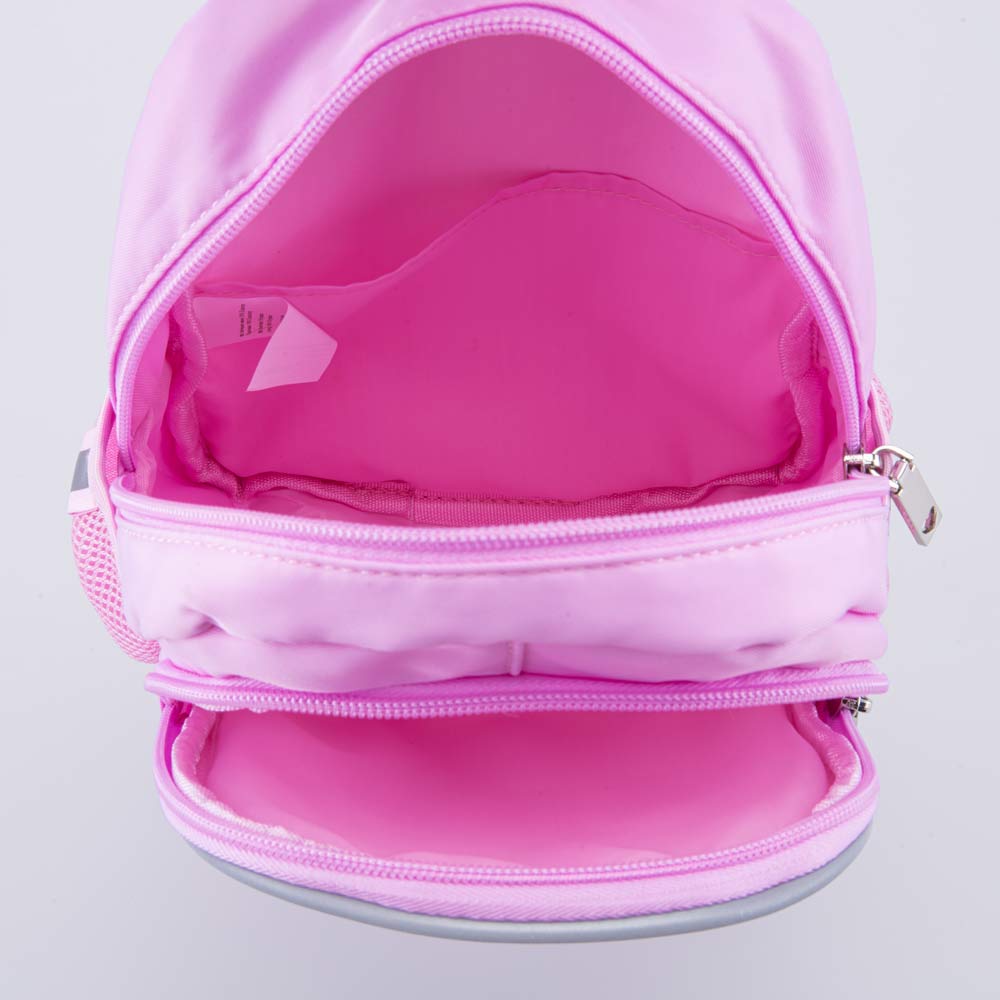 Этот розовый рюкзак имеет одно просторное отделение и передний карман на молнии, а также два боковых кармашка из сеточки, куда удобно положить, например, бутылочку с водой.