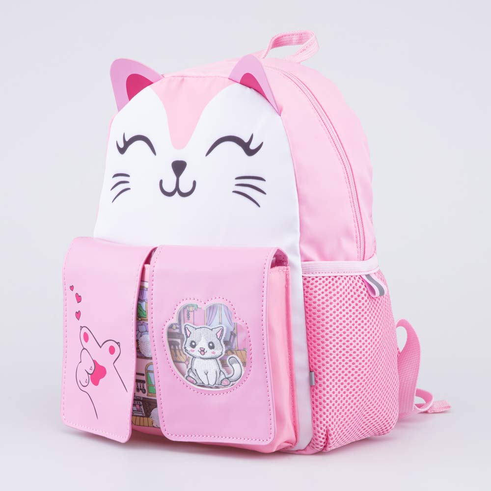 Детский рюкзак для девочки – удобный аксессуар, который обеспечивает комфорт во время повседневных городских прогулок или путешествий и поднимает настроение. На переднем кармашке нанесено изображение комнат с местами для крепления патча – легко создавать свою историю о милой кошечке.