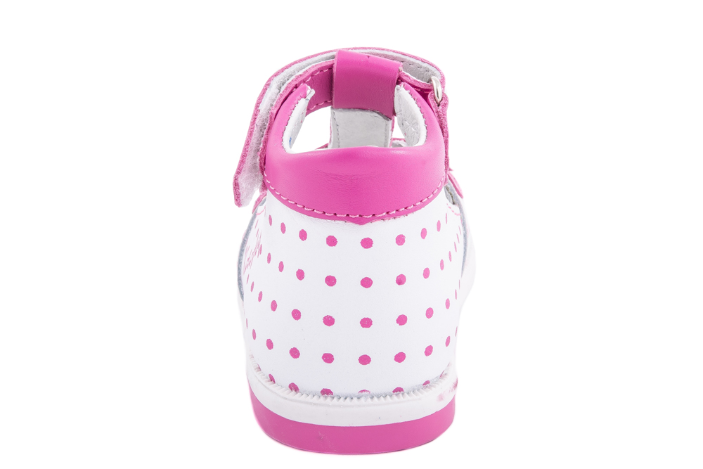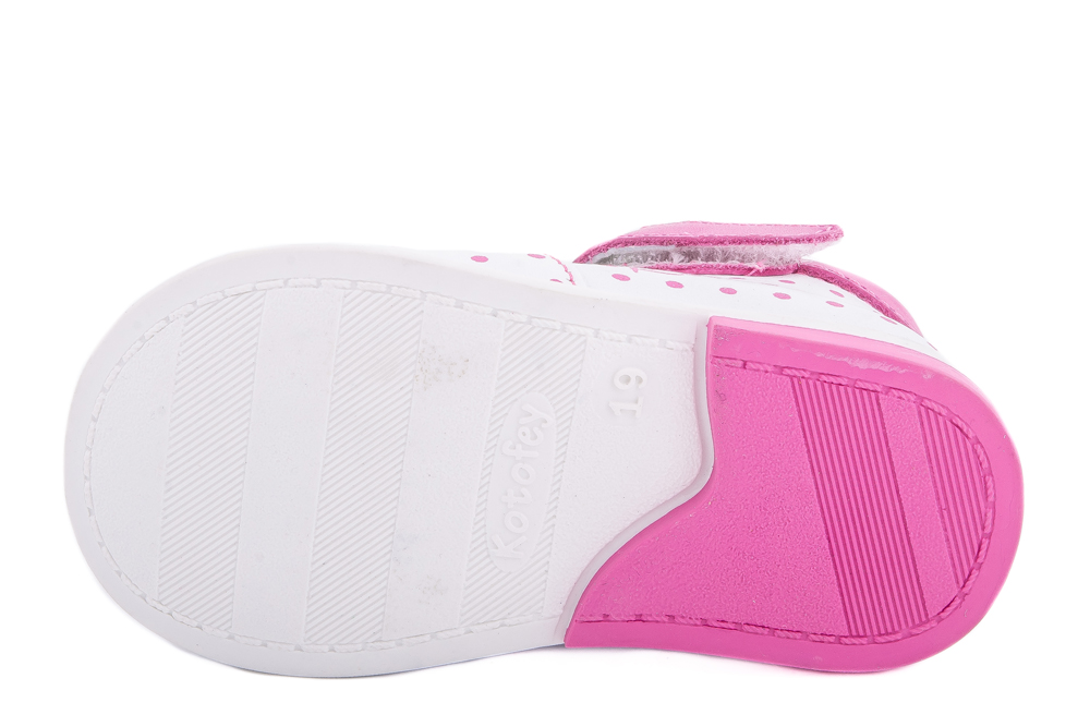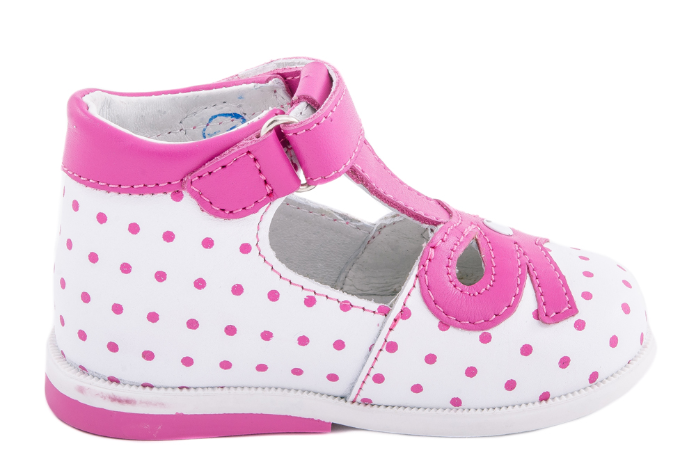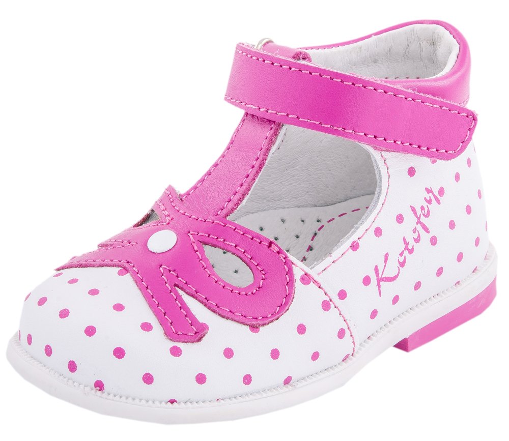 Чудесные туфельки для маленькой девочки, из мягкой кожи, украшенной принтом «горошек». Благодаря натуральным материалам и сквозным отверстиям в носочной части внутри обуви создается благоприятный микроклимат и ножка не потеет. Удобный ремешок на липучке позволяет быстро обувать и снимать обувь. Мягкий манжет создает комфорт при ходьбе и предотвращает натирание ножки ребенка. Подошва с небольшим каблучком легкая и гибкая. Эти милые туфельки отлично подойдут как на каждый день, так и для торжественного мероприятия или утренника.