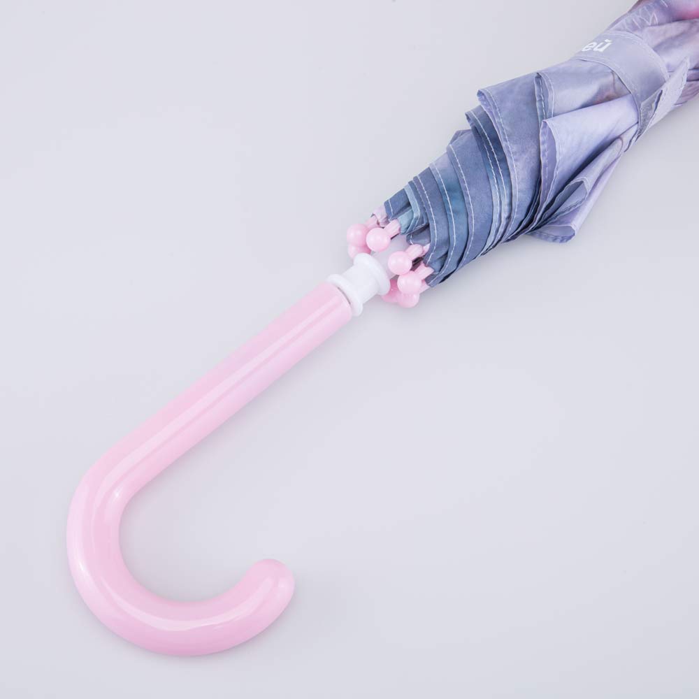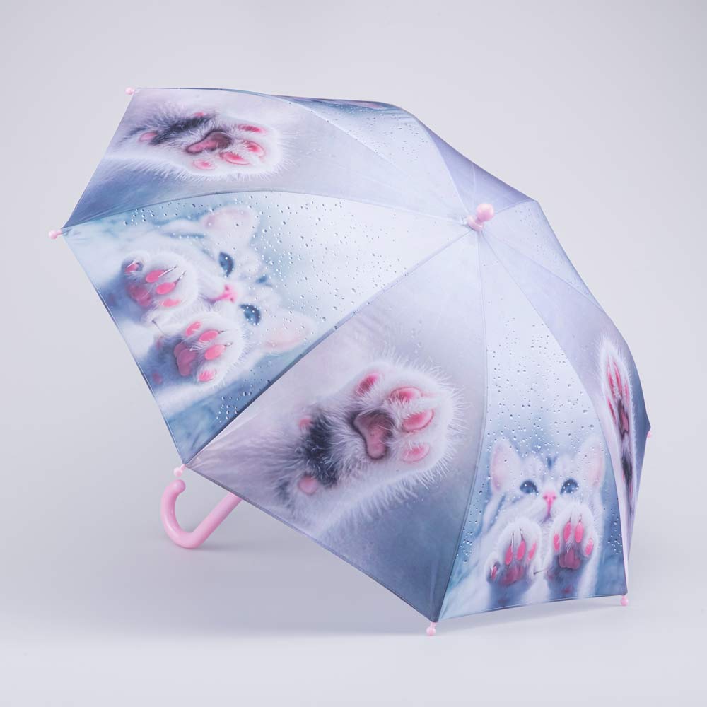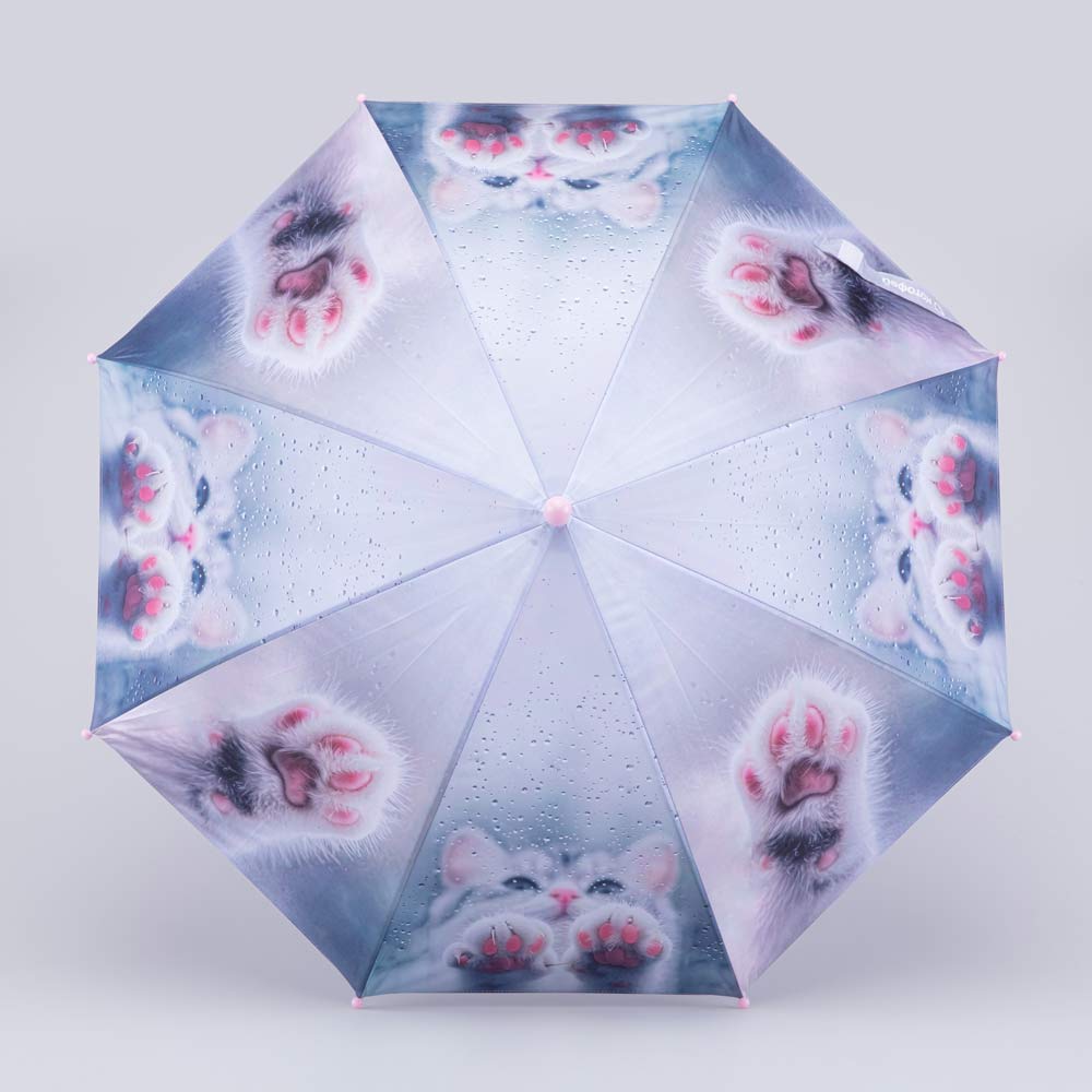 Детский механический зонт-трость для девочки является надежным и безопасным аксессуаром для ребенка, а красочный принт в виде милой кошечки поднимает настроение в дождливую погоду.