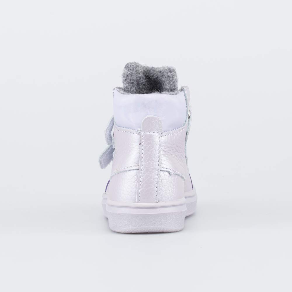 Верх выполнен из натуральной кожи нежно-сиреневого цвета. Подкладка из шерстяной байки и войлочная стелька удерживают тепло и обеспечивают здоровый микроклимат вокруг ножки.