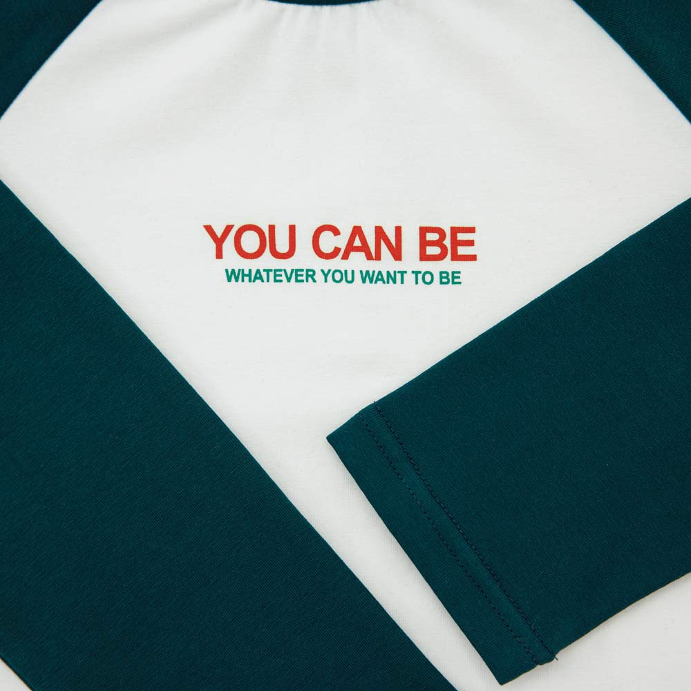 Лонгслив с рукавами реглан контрастного зеленого цвета украшен минималистичным принтом в виде надписи Ты можешь быть тем, кем захочешь. Такая удобная одежда для мальчика отлично подходит для прогулок, для походов в гости, а также в качестве одежды для детского сада, кружка или секции.