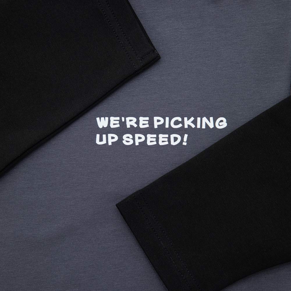 Черный лонгслив с двойным рукавом украшен минималистичным принтом в виде надписи Мы набрали скорость. Такая удобная одежда для мальчика отлично подходит для прогулок, для походов в гости, а также в качестве одежды для школы, кружка или секции.
