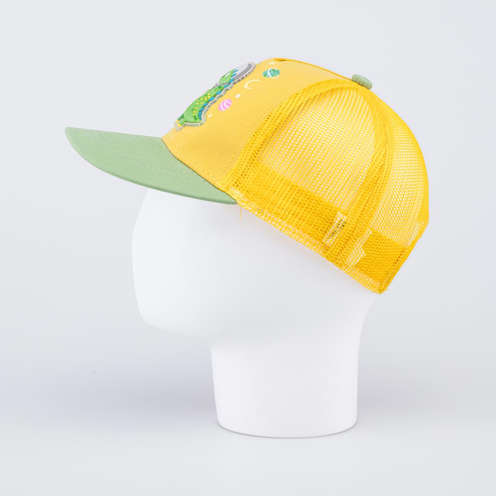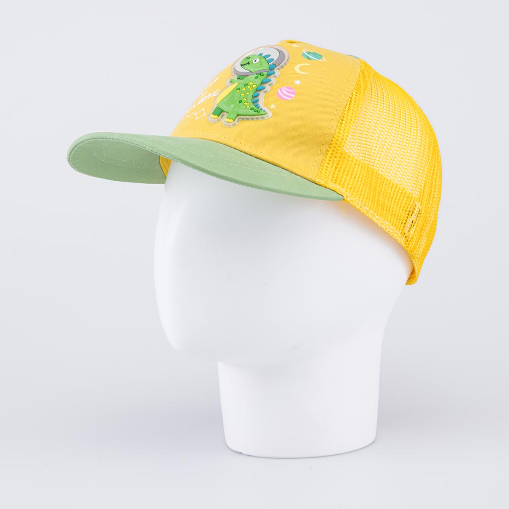 Яркая летняя бейсболка для мальчика украшена силиконовой нашивкой в виде динозавра. Детская кепка с козырьком защищает голову от солнца и ветра и является незаменимым головным убором на весну, лето и осень, а также в садик.