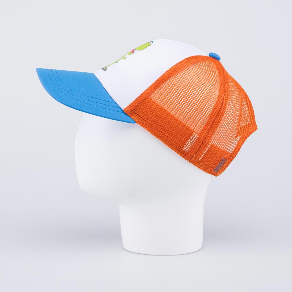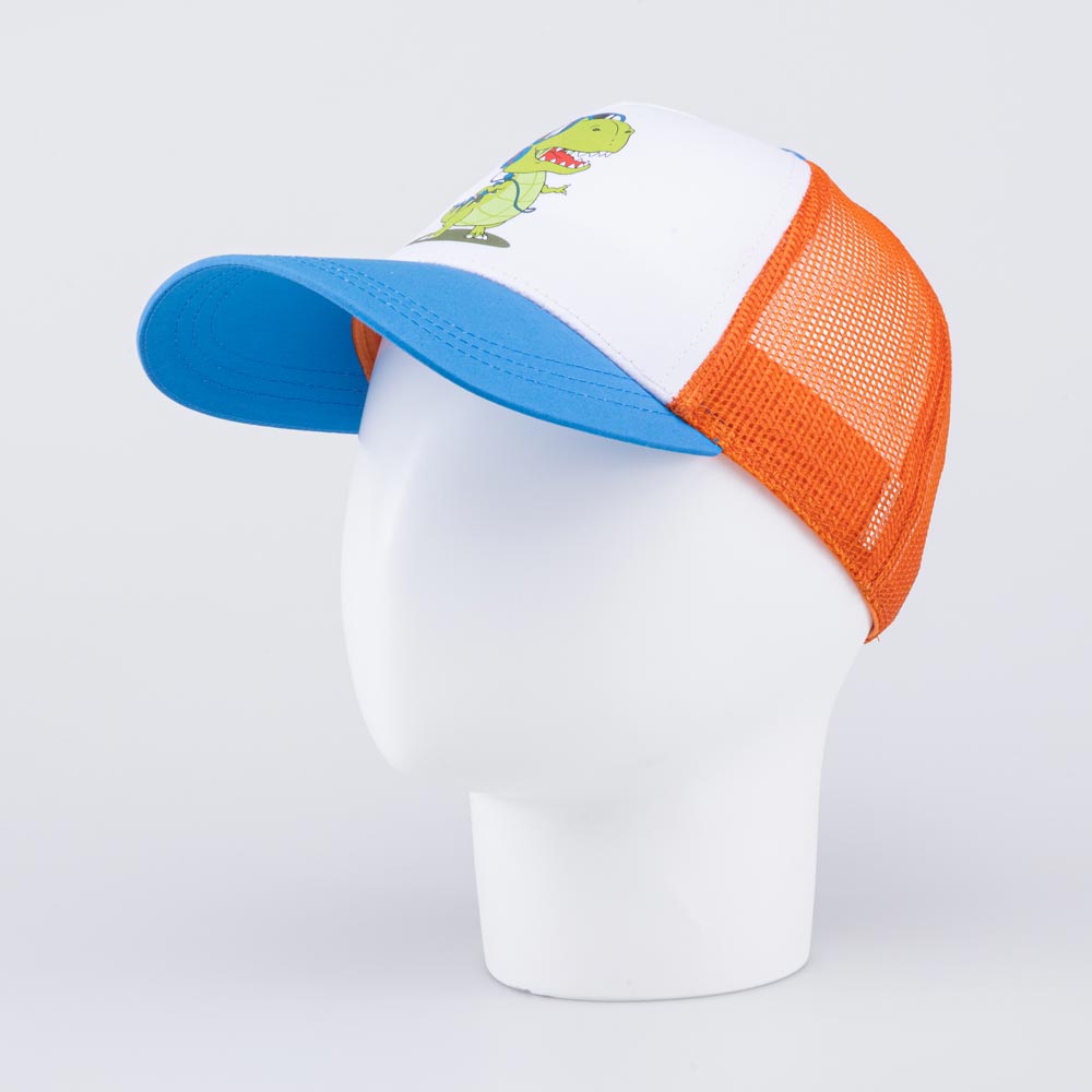 Яркая летняя бейсболка для мальчика украшена принтом в виде динозавра. Детская кепка с козырьком защищает голову от солнца и ветра и является незаменимым головным убором на весну, лето и осень, а также в садик.