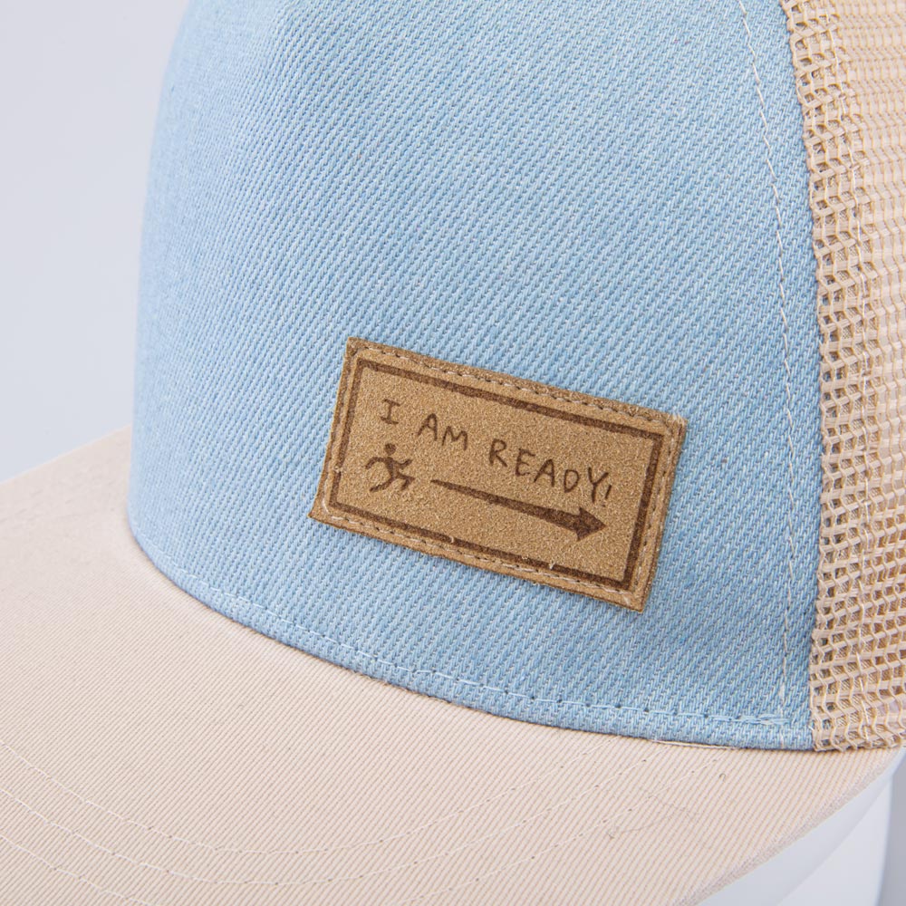 Летняя бежевая с голубым бейсболка для мальчика украшена кожаной нашивкой с тиснением. Детская кепка с козырьком защищает голову от солнца и ветра и является незаменимым головным убором на весну, лето и осень, а также в садик.