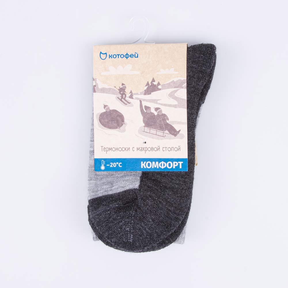 Термоноски обладают усилением двойной нитью в районе стопы. Носок, подошва и пятка выполнены в контрастном цвете, обозначая границы зоны максимального утепления ноги ребенка. В районе свода стопы и щиколотки пряжа тоньше, благодаря этому обувь со шнуровкой носится комфортнее.