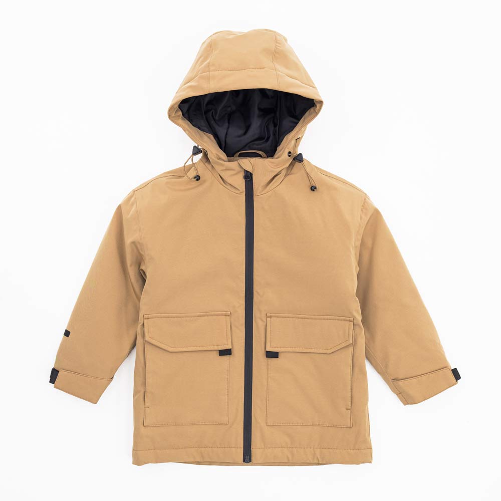 Удобная и практичная бежевая куртка-парка с капюшоном на весну и осень разработана для мальчика.