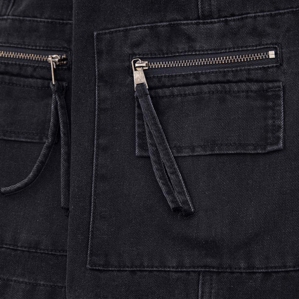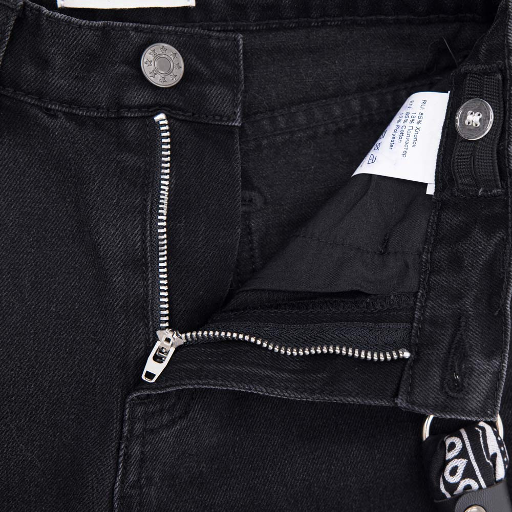 Модель черного цвета выполнена из прочной хлопчатобумажной ткани диагонального переплетения (деним) и украшена декоративным элементом в виде платка на карабине, который пристегнут к одной из шлевок для ремня.