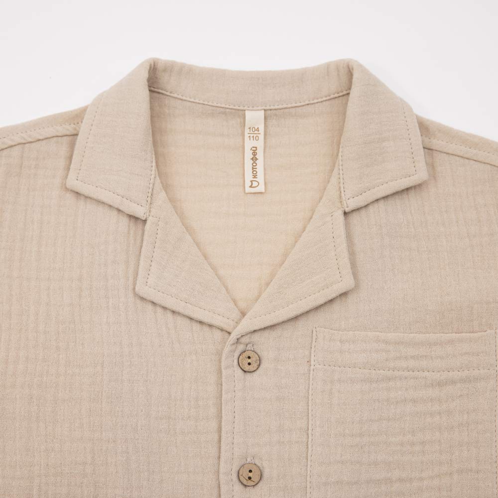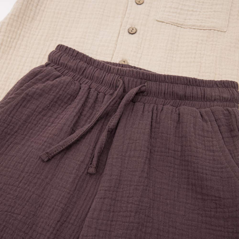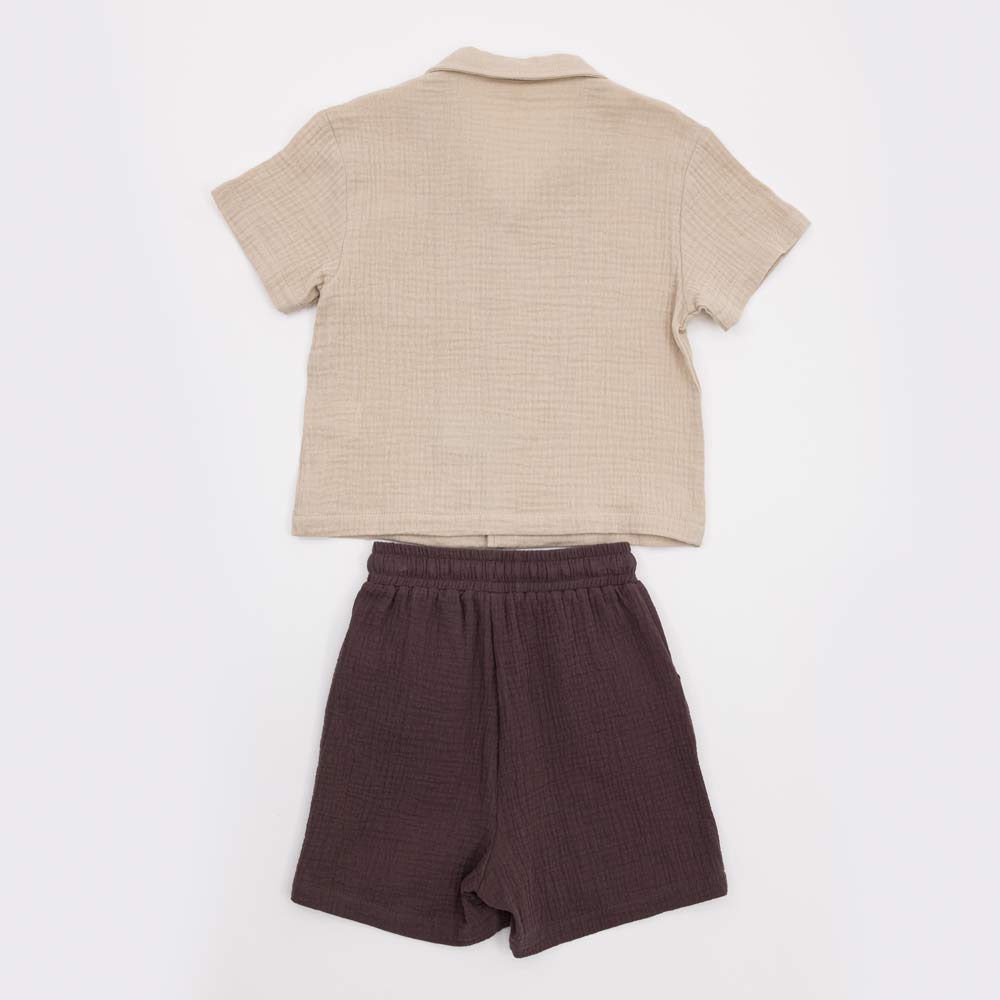 Летний легкий муслиновый костюм-двойка для мальчика, состоящий из рубашки с коротким рукавом и шорт, выполнен в теплых шоколадных оттенках. Модель имеет свободный силуэт для комфорта движений и отлично подходит для прогулок, для отпуска, для путешествий, для моря, а также для носки в садик.