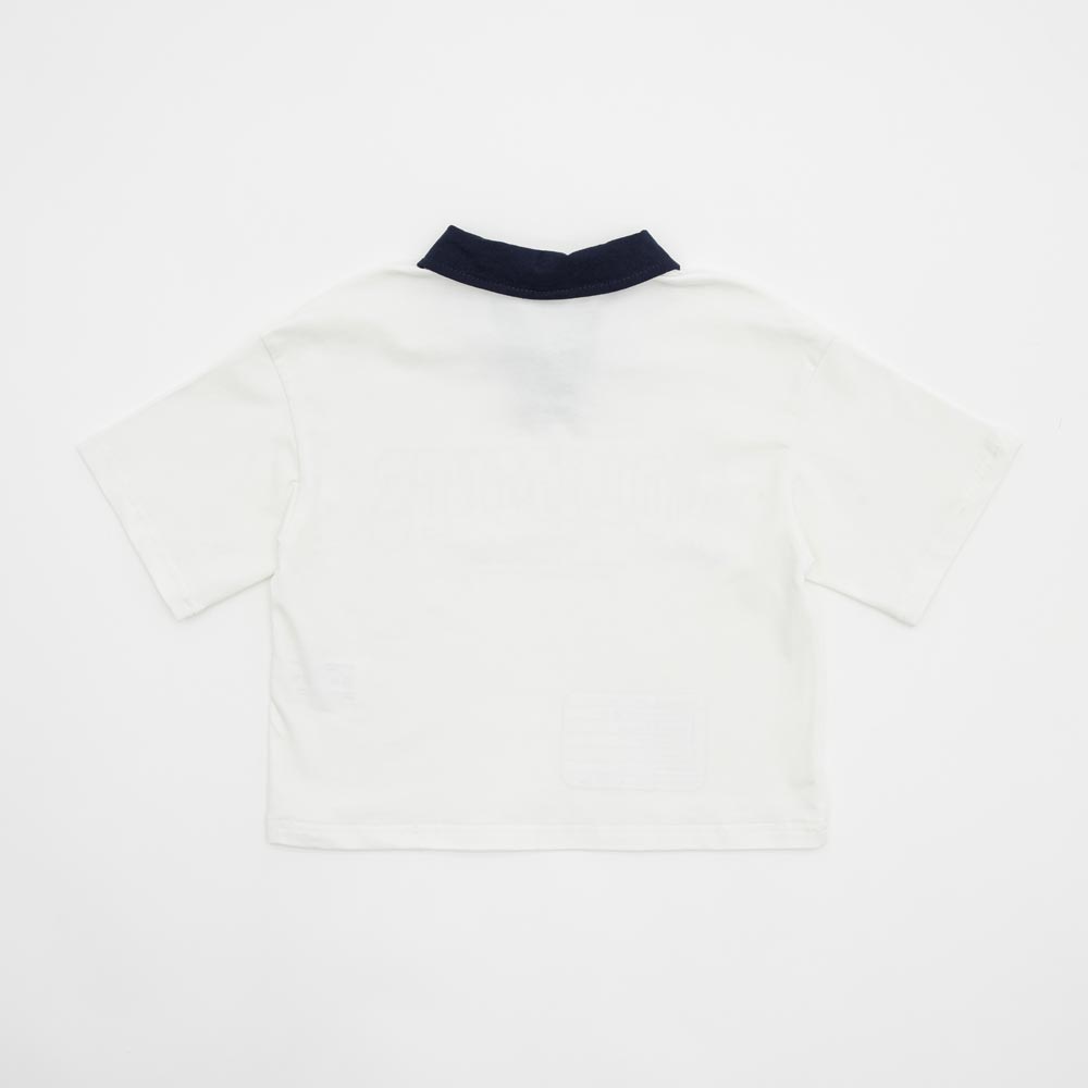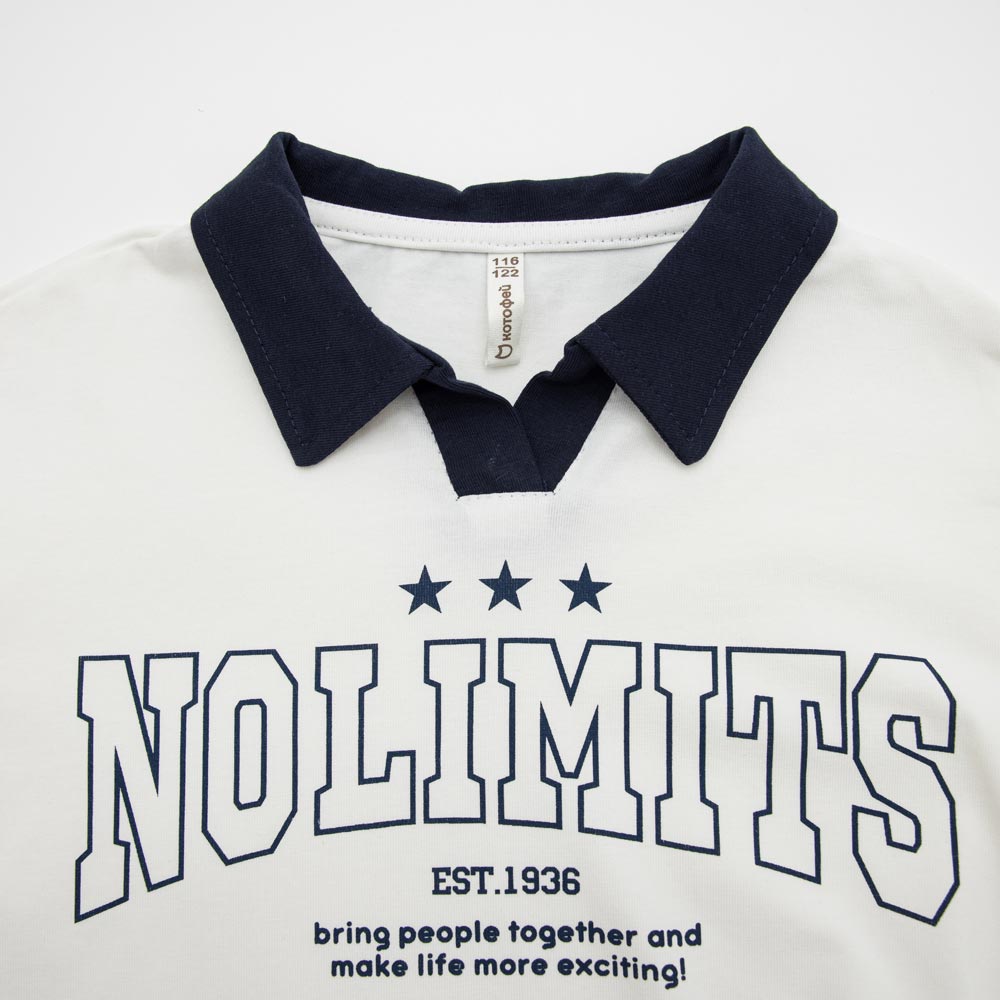 Детская и подростковая белая укороченная футболка-кроп силуэта оверсайз с воротничком поло подходит для девочки. Модель в спортивном стиле декорирована крупным контрастным принтом. Она отлично подходит на весну, на лето и на осень, а также в качестве одежды в садик, в кружок, на физкультуру в школу или на спортивную секцию.