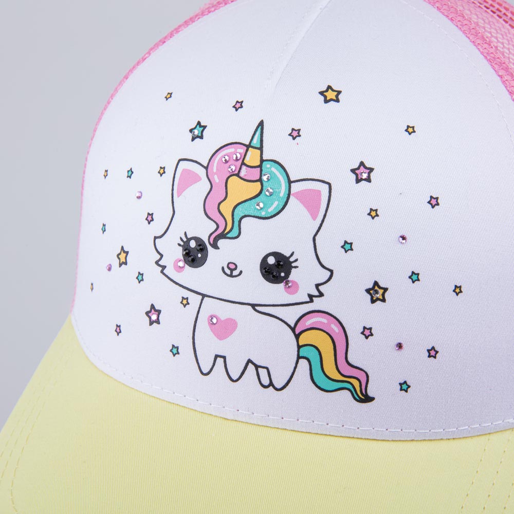 Яркая летняя бейсболка для девочки украшена стразами и популярным принтом в виде единорога. Детская кепка с козырьком защищает голову от солнца и ветра и является незаменимым головным убором на весну, лето и осень, а также в садик.
