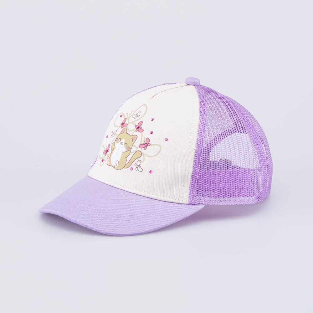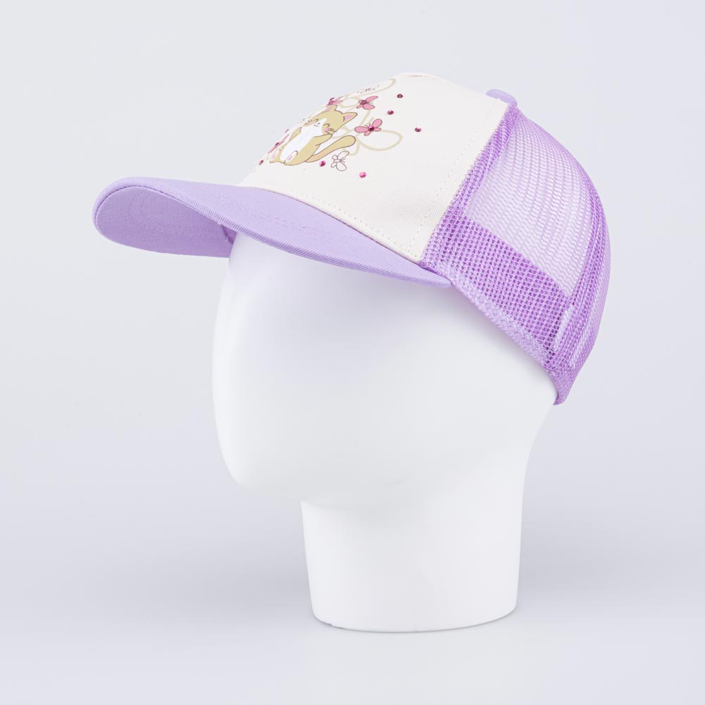 Яркая летняя бейсболка для девочки украшена стразами и принтом в виде котенка. Детская кепка с козырьком защищает голову от солнца и ветра и является незаменимым головным убором на весну, лето и осень, а также в садик.