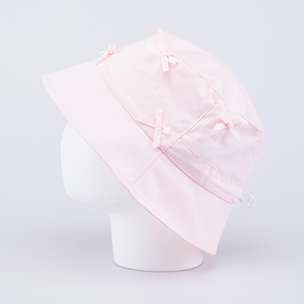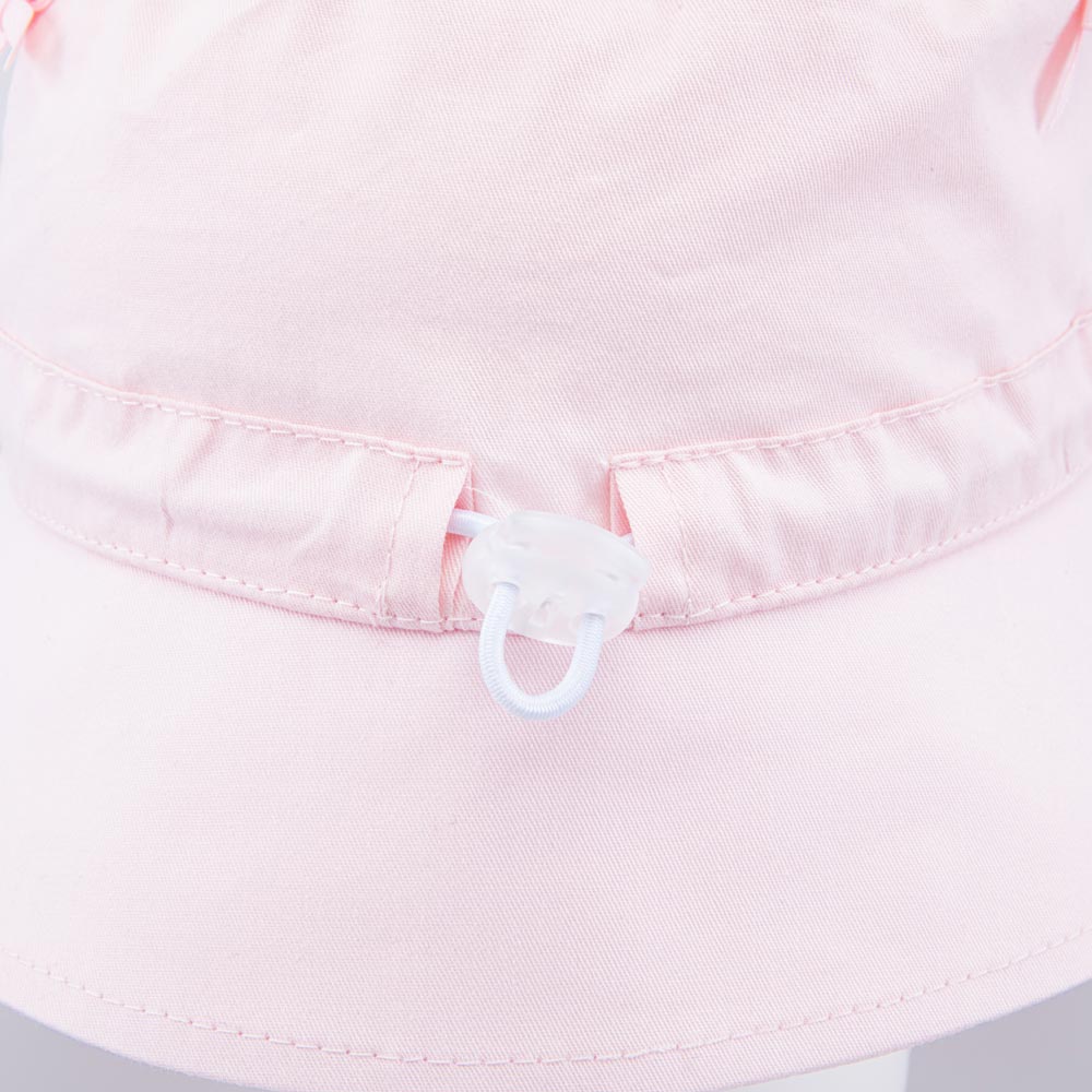 Розовая панама для детей оснащена резинкой с фиксатором – не придется переживать, что ветер сорвёт ее с головы.