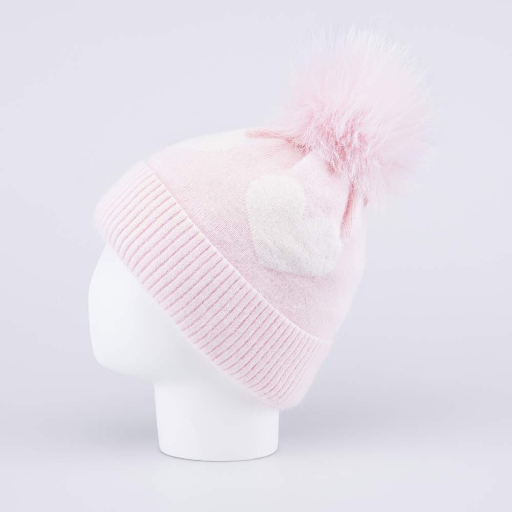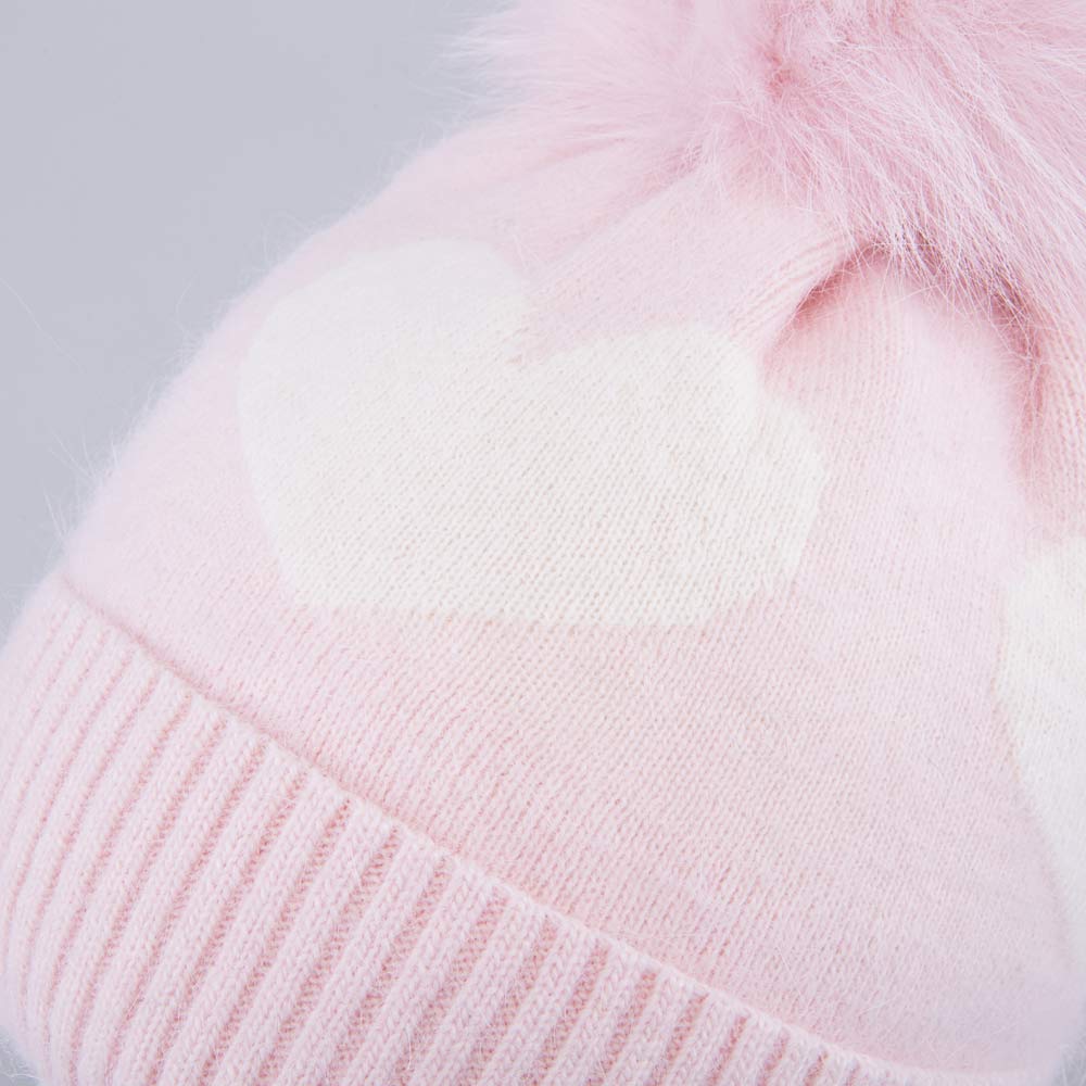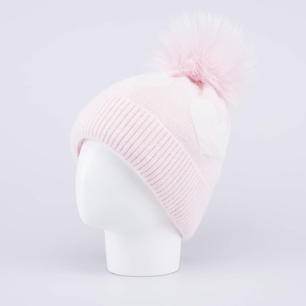 Розовая шерстяная шапка с помпоном из натурального меха енота и без завязок комфортно облегает голову и подходит для зимней прогулки и активного отдыха.
