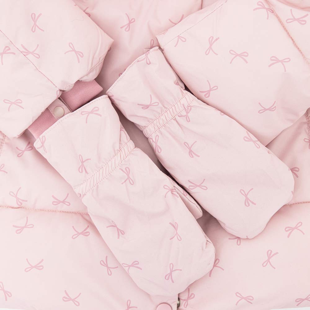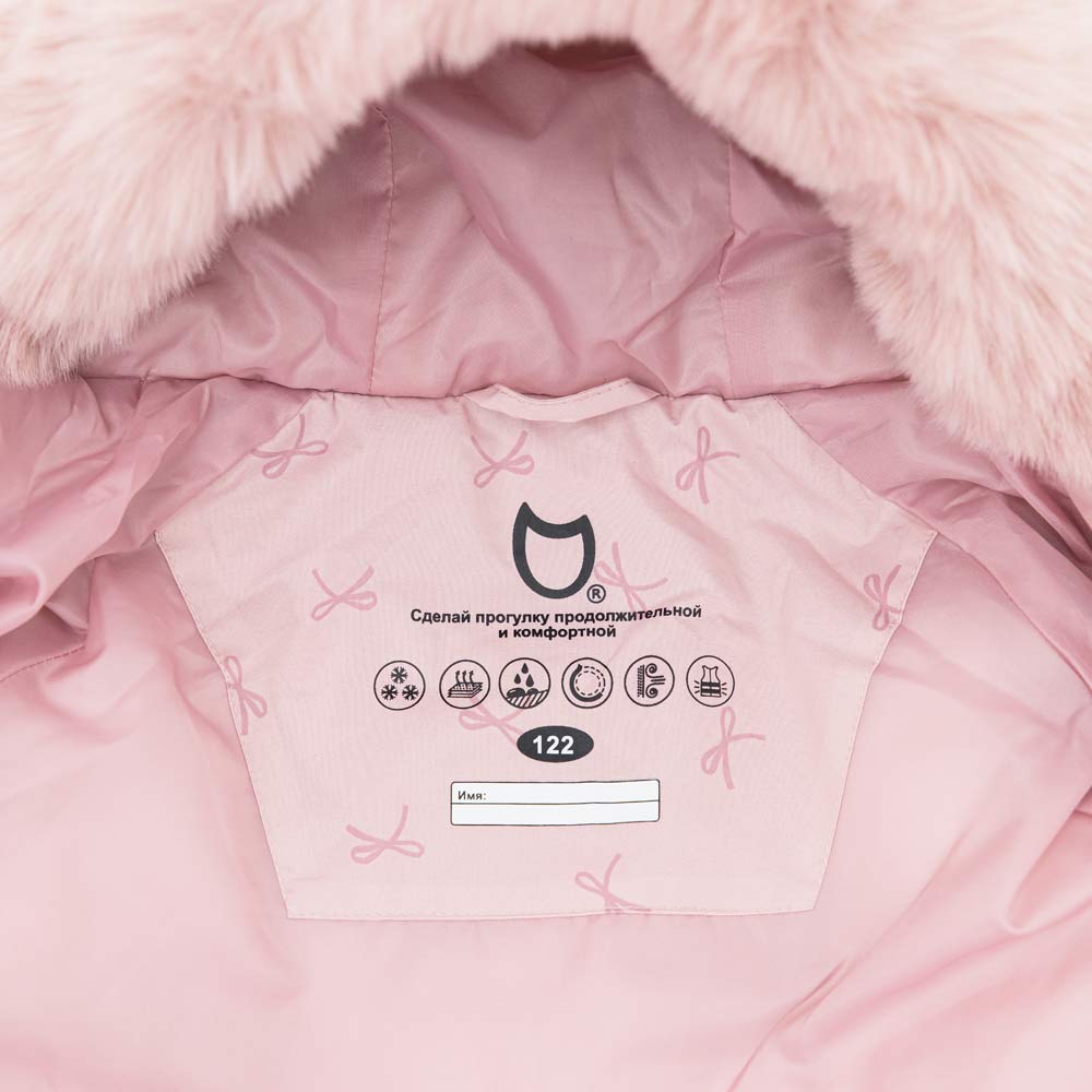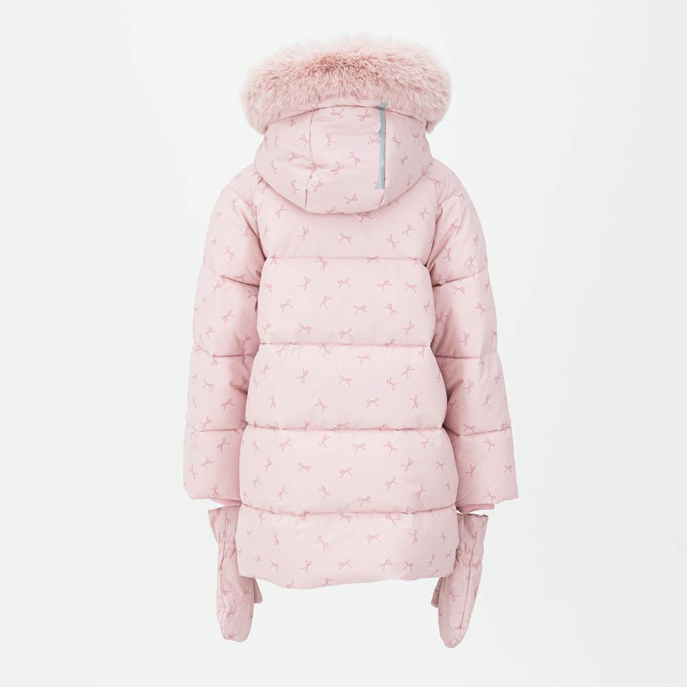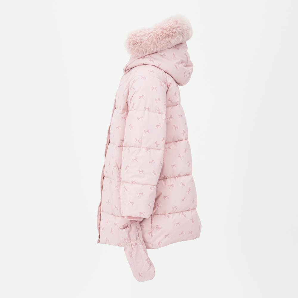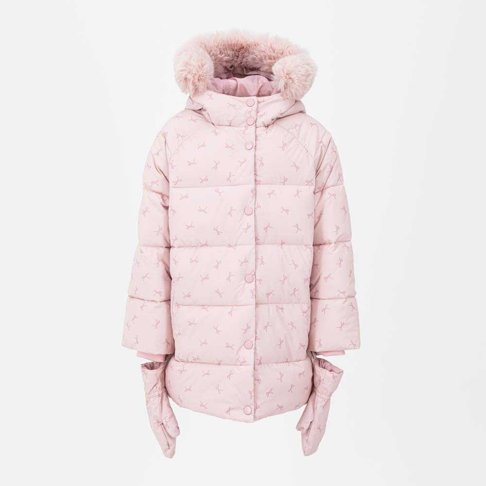 Розовое детское пальто на зиму дополнено варежками с аналогичным принтом, которые пристегиваются к рукавам. Удлиненная модель с капюшоном обеспечивает максимальный комфорт для детей.