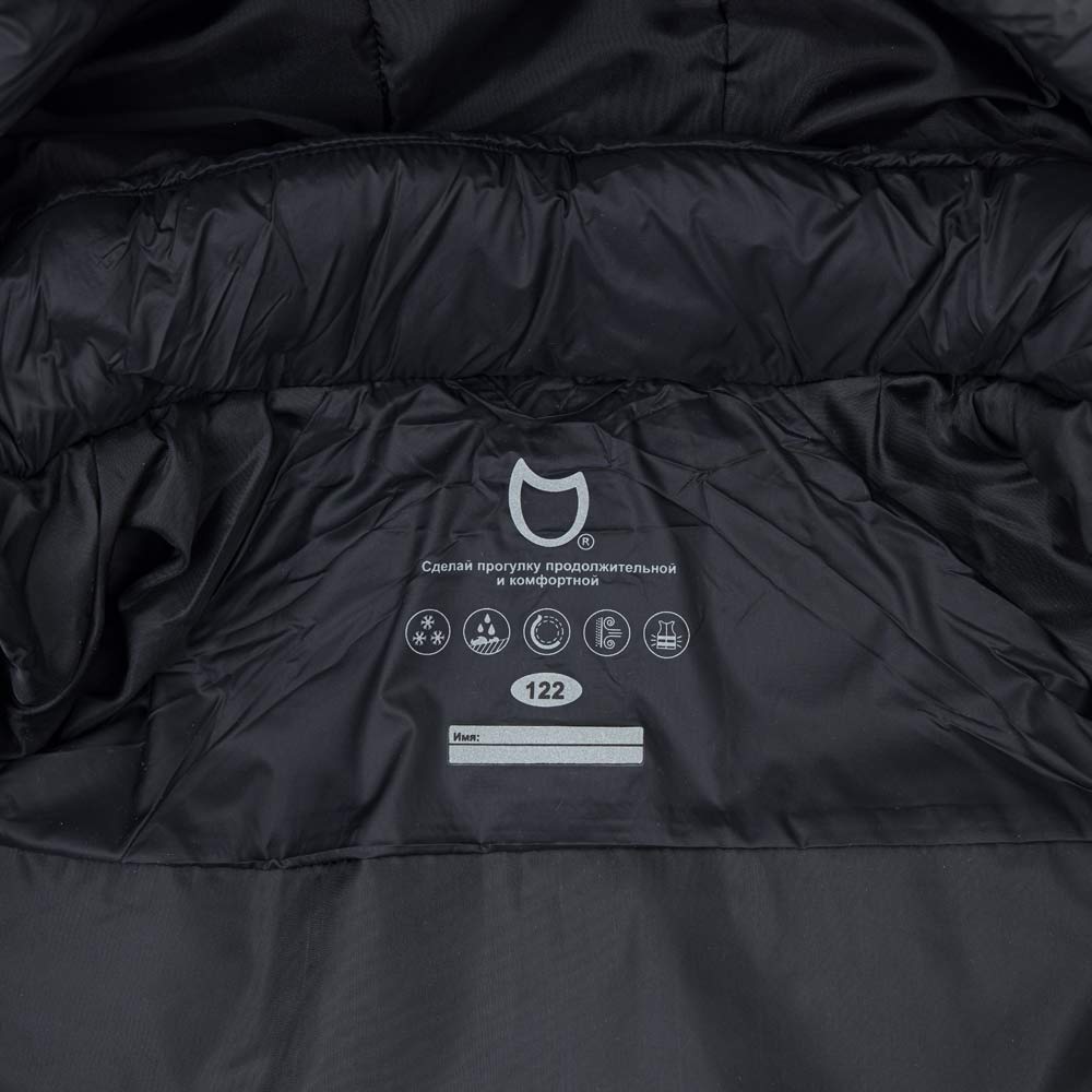 - несъемный капюшон без опушки переходит в переднюю планку, которая застегивается на магнитную кнопку и липучки;
