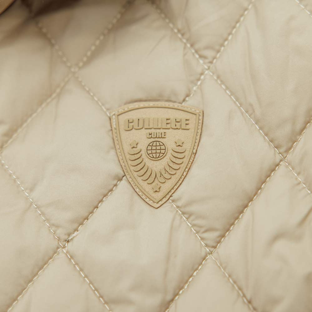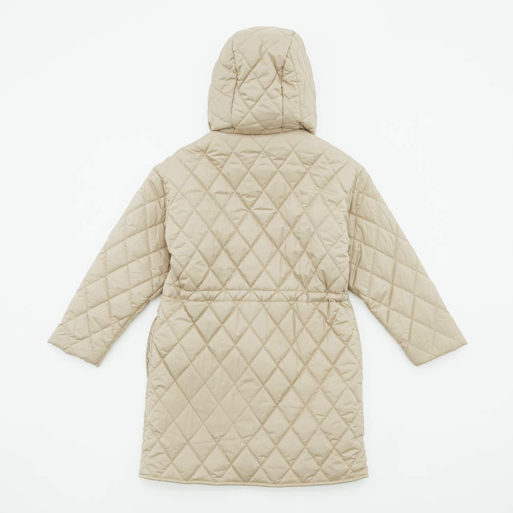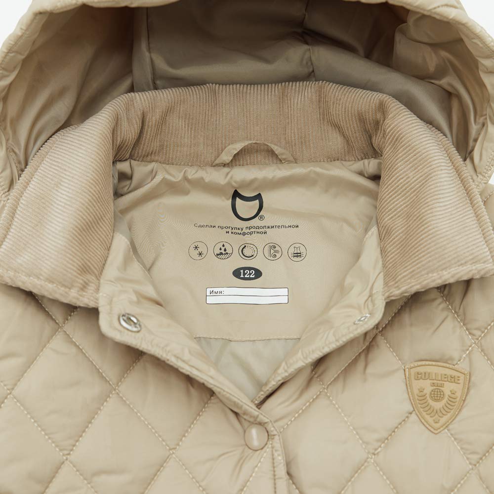Демисезонное пальто с капюшоном подходит для повседневной носки в городских условиях и хорошо сочетается со школьной формой. Это модное стеганое пальто изготовлено из непродуваемого текстиля спокойного бежевого цвета, обработанного водоотталкивающей пропиткой.