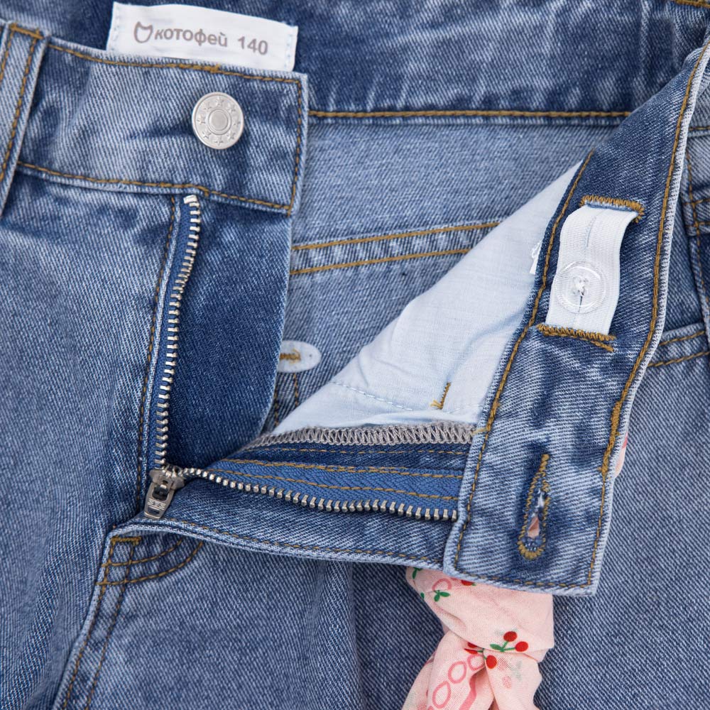 Модель голубого цвета выполнена из прочной хлопчатобумажной ткани диагонального переплетения (деним) и украшена декоративным элементом в виде платка, который привязан на одной из шлевок для ремня.