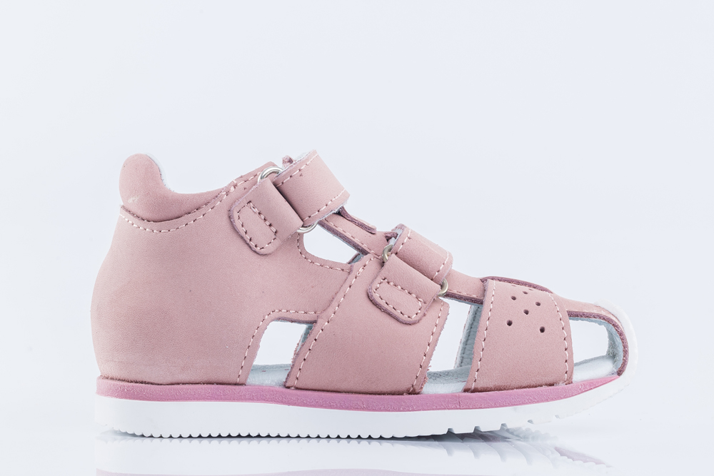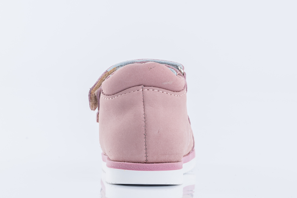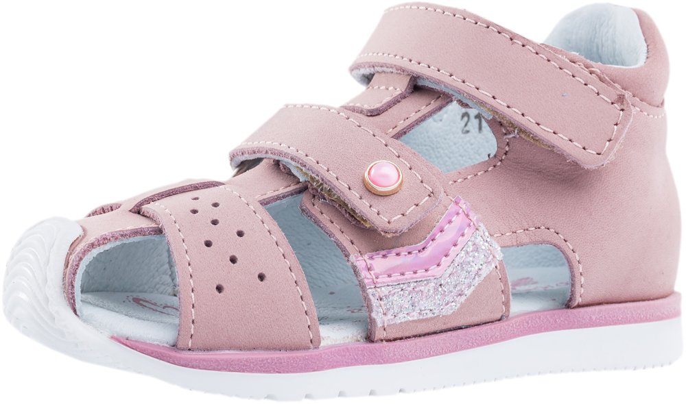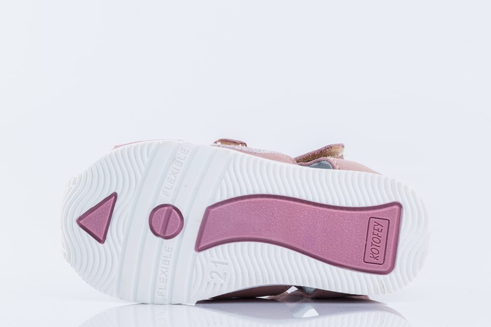 Туфли летние выполнены полностью из натуральной кожи приглушенного розового цвета. Два ремня с велькро(липучкой) обеспечивают идеальную посадку по ноге. Мягкий манжет создает комфорт при ходьбе и предотвращает натирание ножки ребенка. Подошва выполнена из прозрачного термоэластопласта с блёстками – легкого, прочного материала, обладающего отличным амортизирующим свойством. Подошва имеет наплыв в носочной части, что увеличит долговечность сандалий и надолго сохранит приятный внешний вид.
