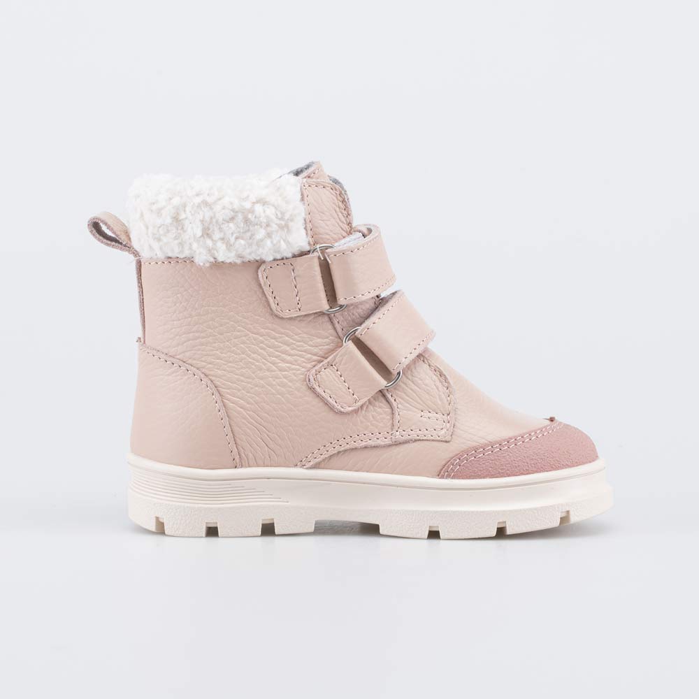 Верх выполнен из натуральной гладкой кожи розового цвета. Манжет декорирован мехом под барашка.