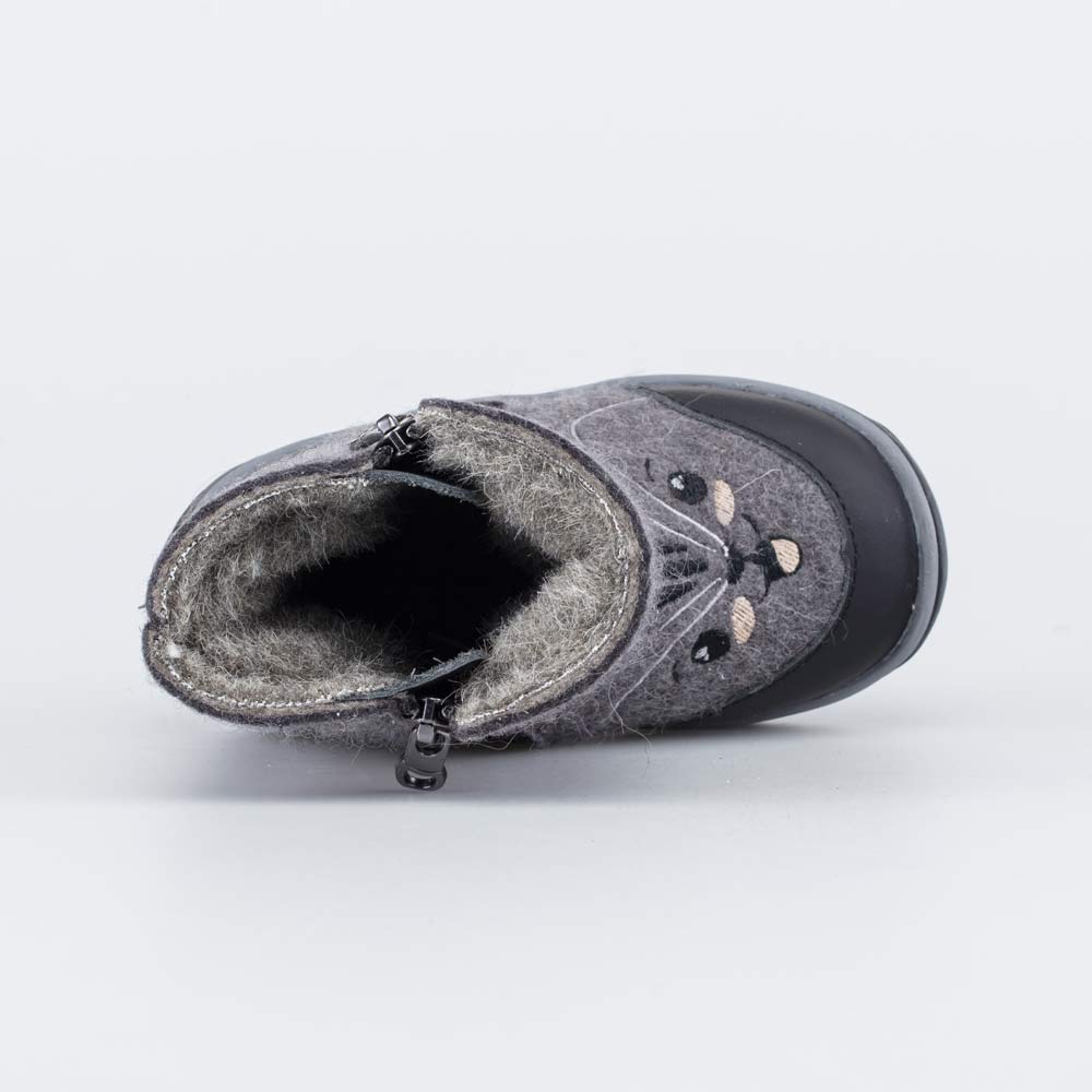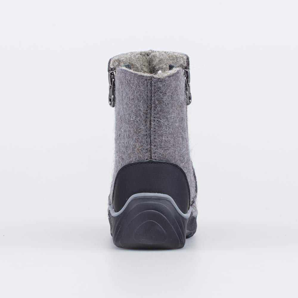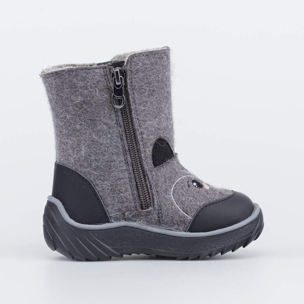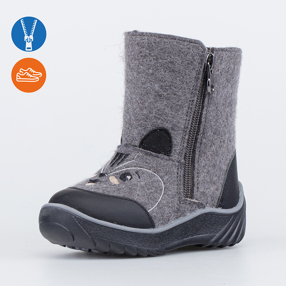 Детские валенки выполнены из серого войлока.