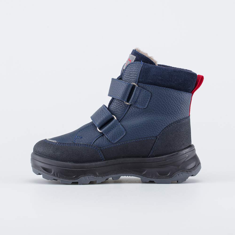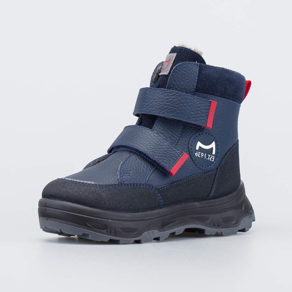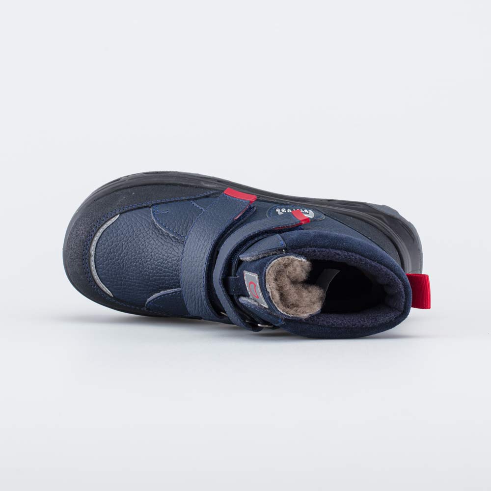 Детские зимние ботинки на овчине, декорированные нашивкой с логотипом Котофей, походят для мальчика.