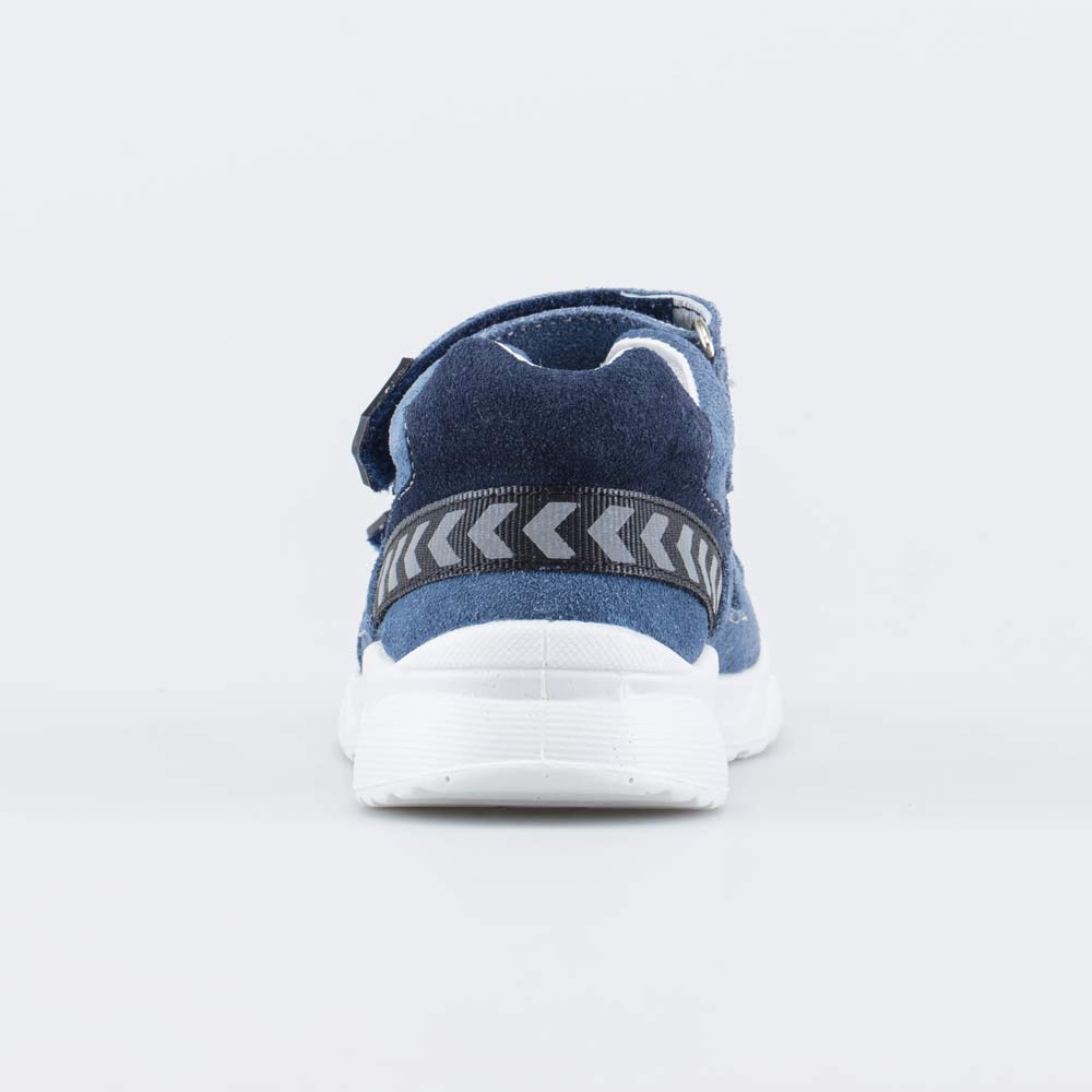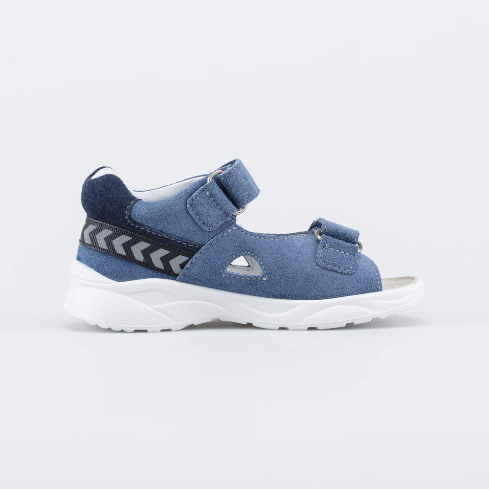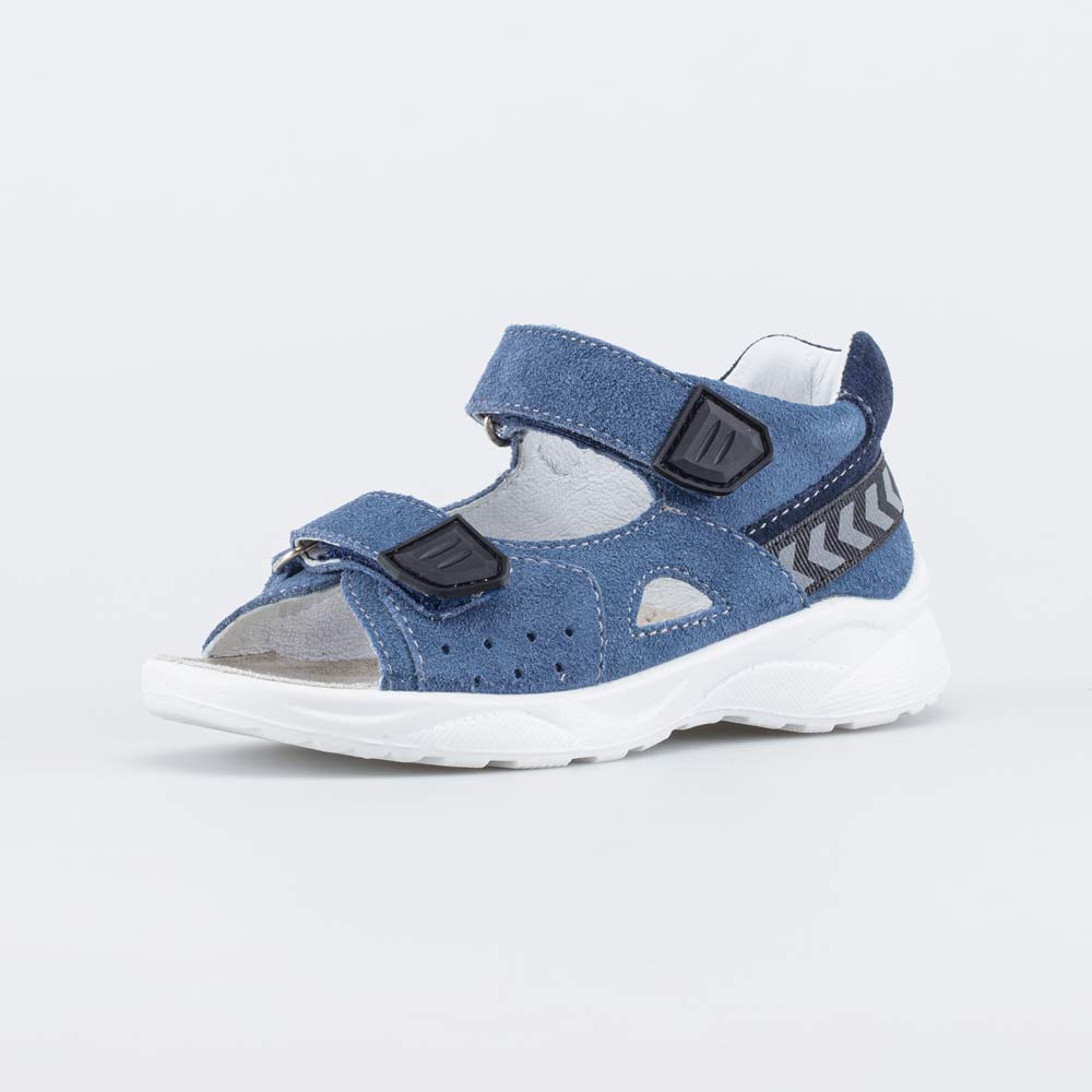 Детские сандалии имеют верх из натурального велюра со светоотражающими вставками (стрелочки). Подкладка и несъемная стелька из белой натуральной кожи обеспечивают гигиенические свойства и защищают носочки от окрашивания.