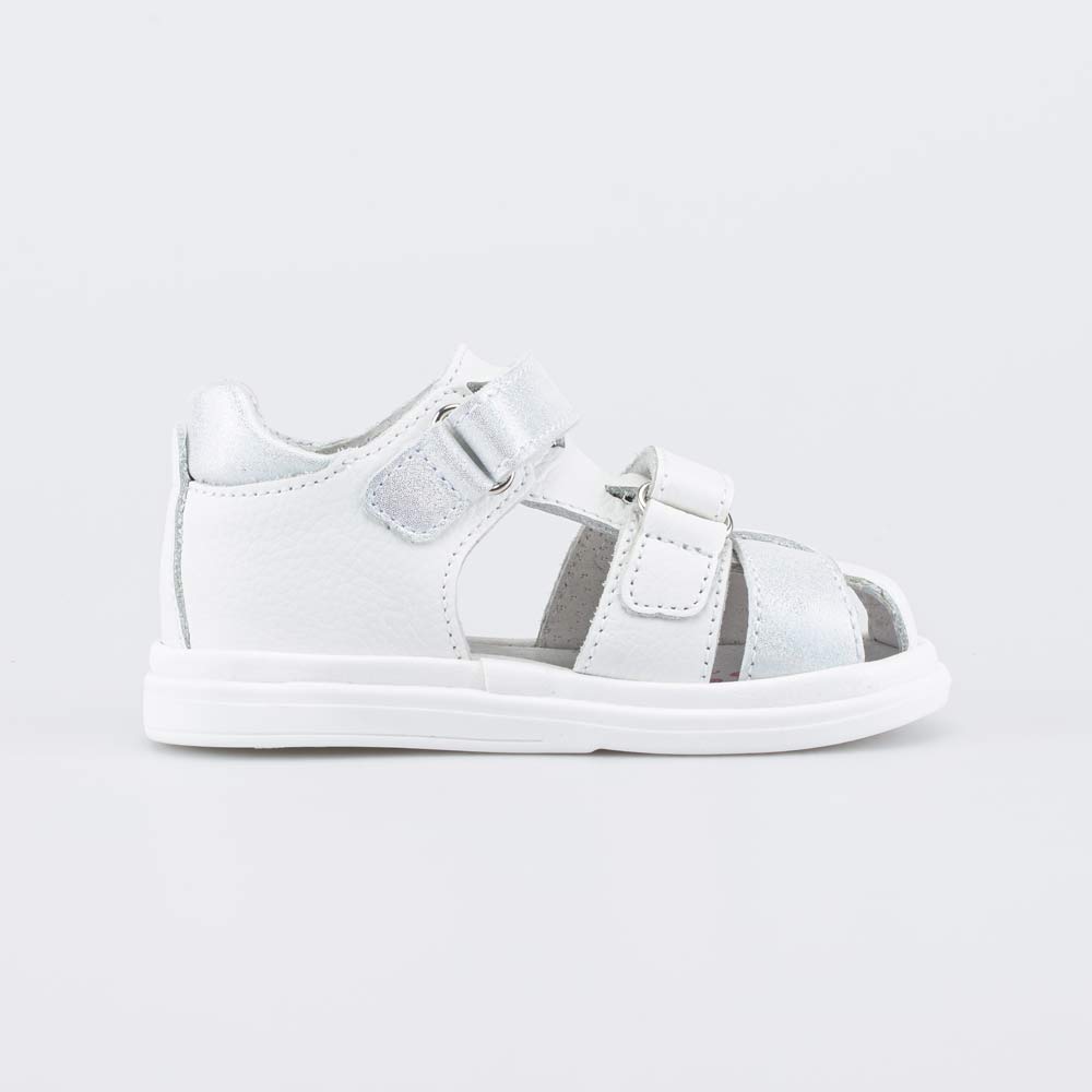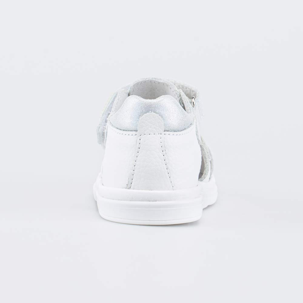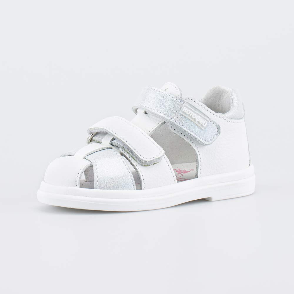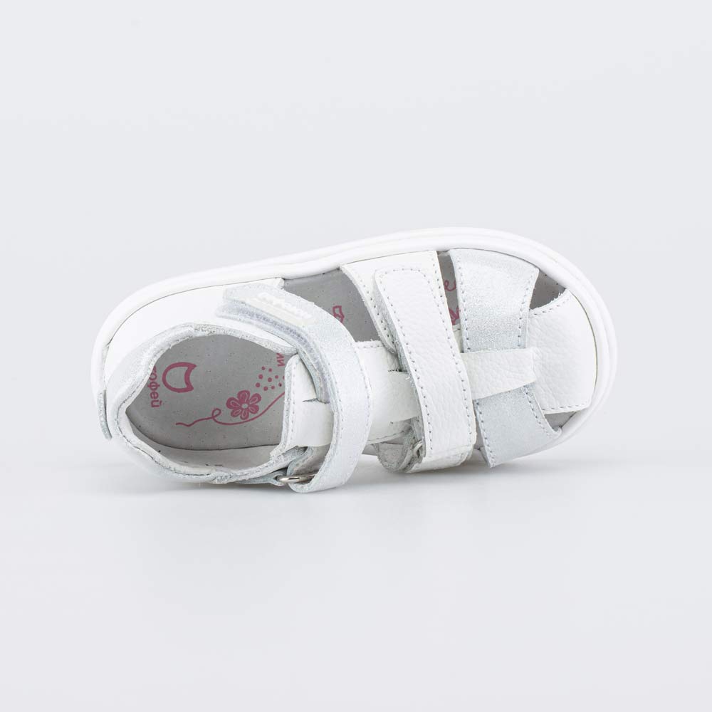Детские сандалии имеют верх, подкладку и несъемную стельку из натуральной кожи белого цвета, что обеспечивает гигиенические свойства и защищает носочки от окрашивания. Декор в виде легкого серебристого блеска придает модели нарядный вид.