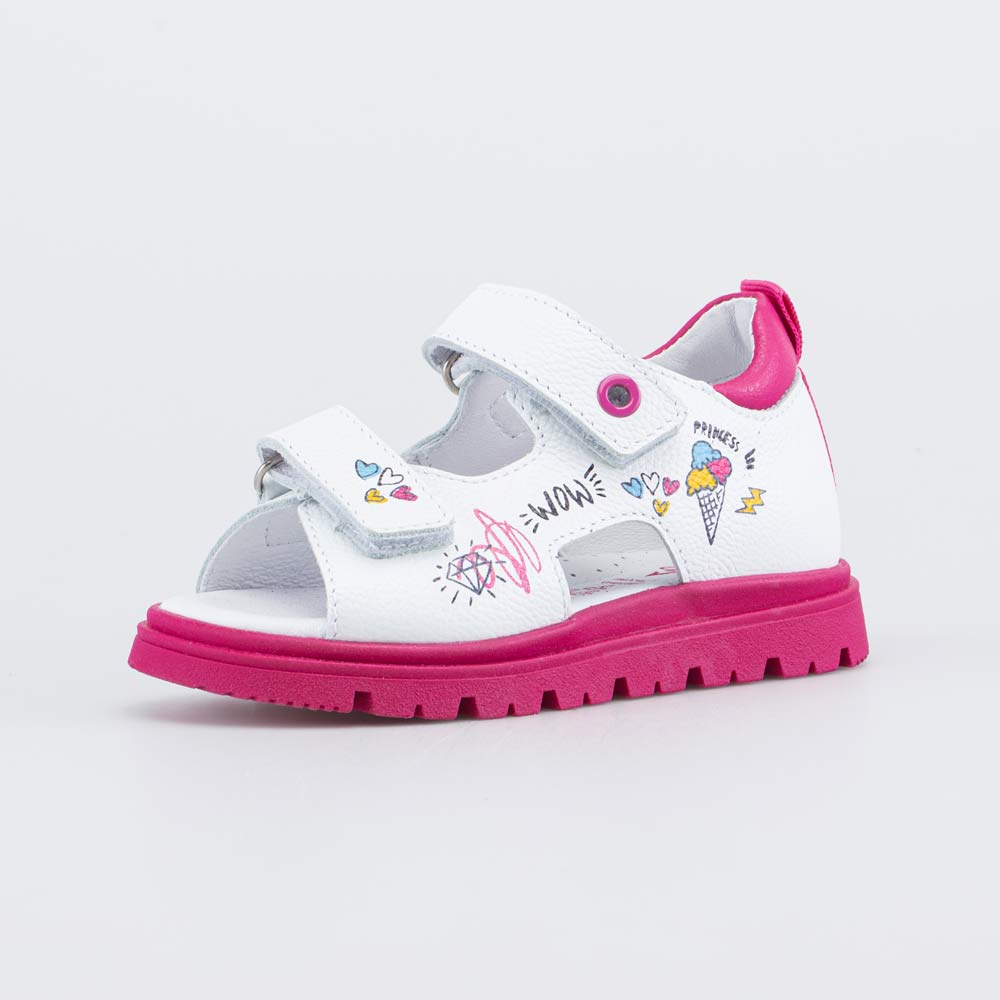 Детские сандалии имеют верх, подкладку и стельку из натуральной кожи белого цвета, что обеспечивает гигиенические свойства и защищает носочки от окрашивания. Летний принт и насыщенные цветовые акценты поднимают настроение.