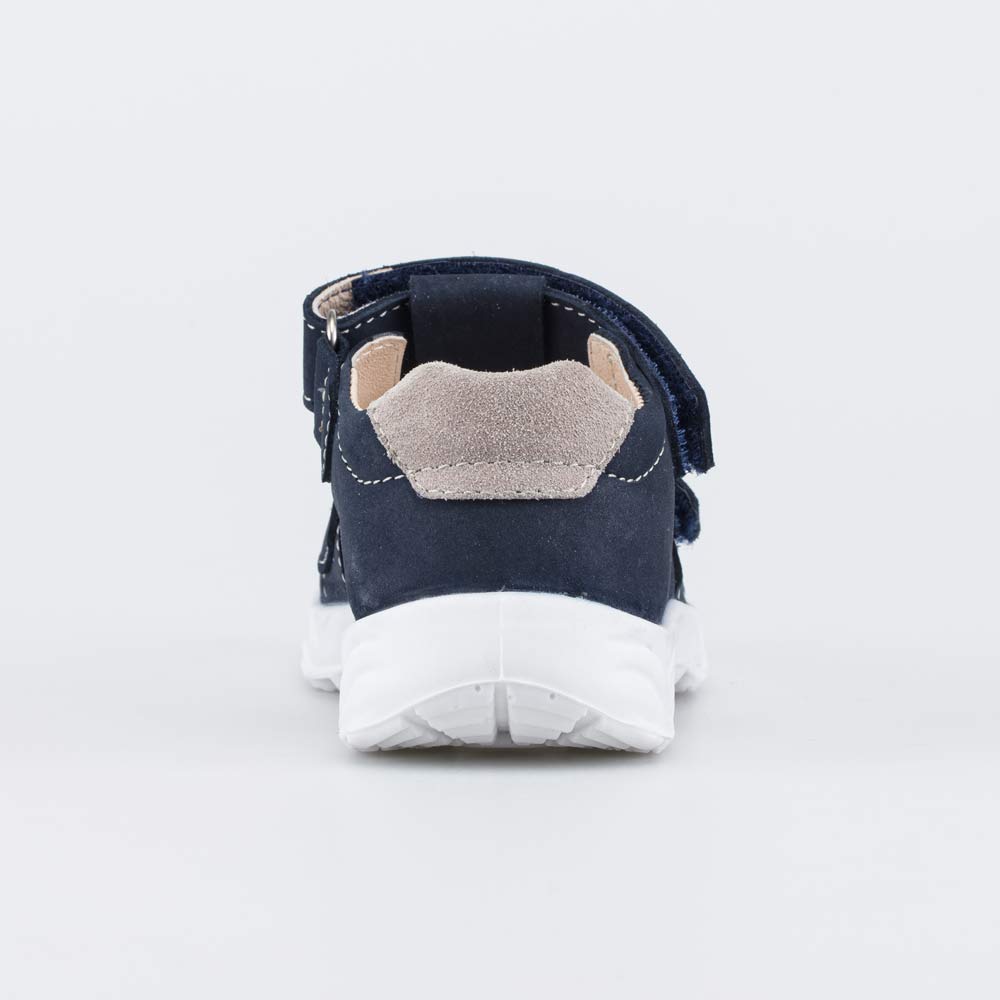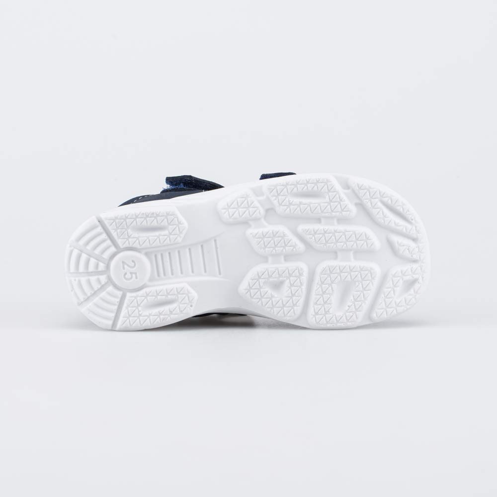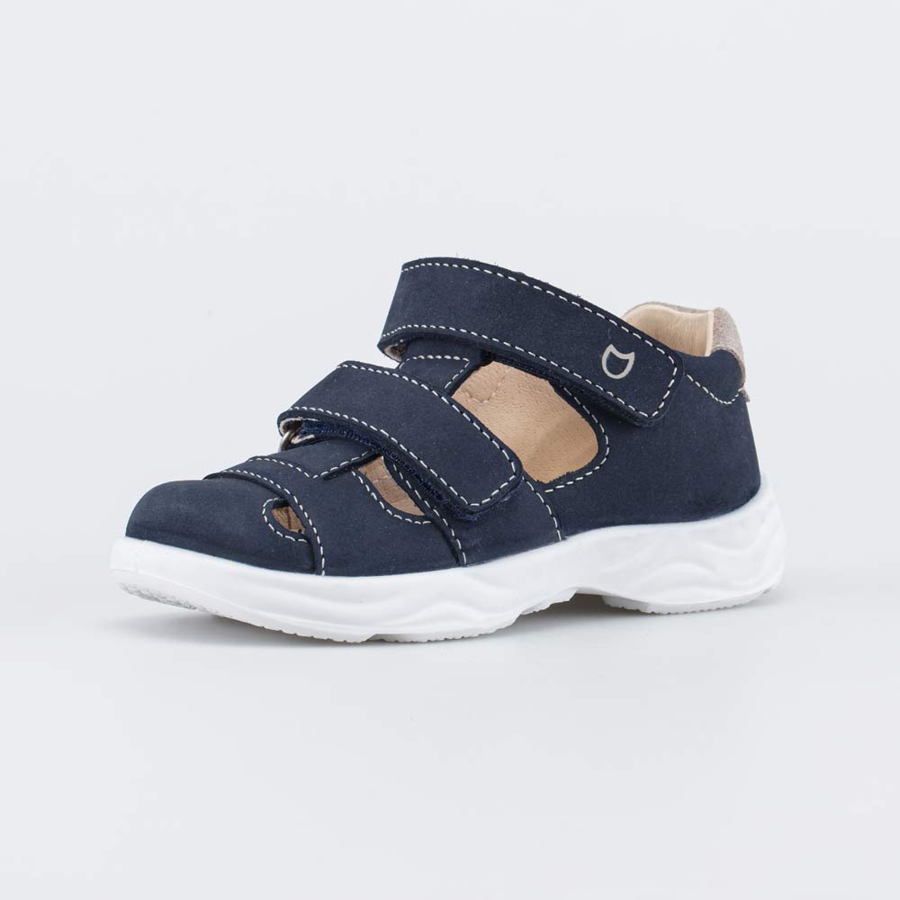 Верх темно-синих сандалий выполнен из гипоаллергенной и дышащей натуральной кожи-нубука. Подкладка и съемная стелька изготовлены из светлой натуральной кожи – не придется переживать, что детская обувь окрасит носочки или колготки.