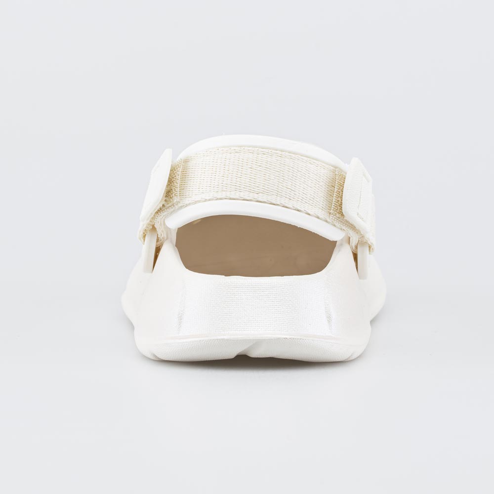 Модель с закрытом носом защищает пальцы от горячего песка или камней на галечном пляже, а перфорация обеспечивает вентиляцию. Мягкий текстильный перекидной ремешок надежно фиксирует обувь при ходьбе.