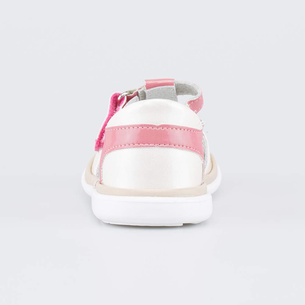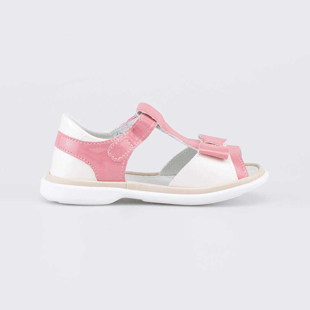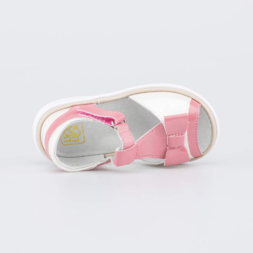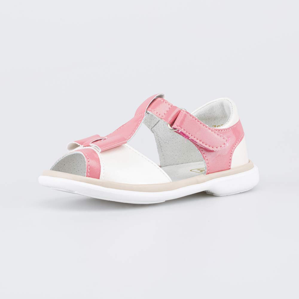 Верх босоножек из высококачественной искусственной кожи выполнен в сочетании розового и молочного. Подкладка и стелька изготовлены из гипоаллергенной и дышащей натуральной кожи светлого оттенка – не придется переживать, что обувь окрасит носочки или колготки.