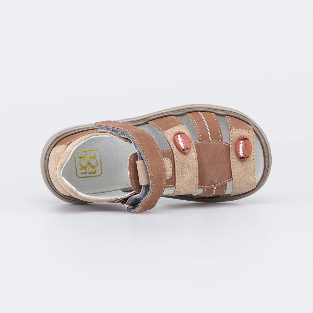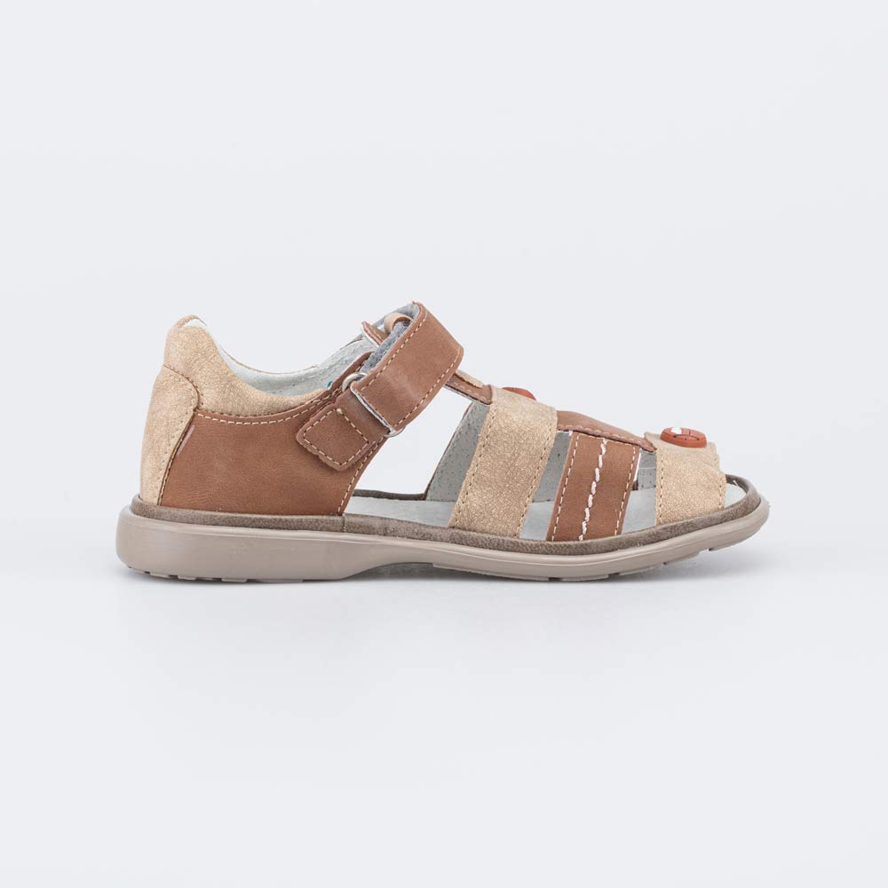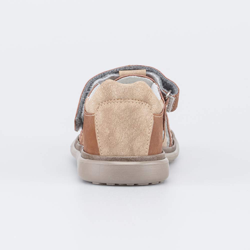 Верх босоножек выполнен из высококачественной искусственной кожи разных оттенков коричневого. Подкладка и стелька изготовлены из гипоаллергенной и дышащей натуральной кожи светлого оттенка – не придется переживать, что обувь окрасит носочки или колготки.