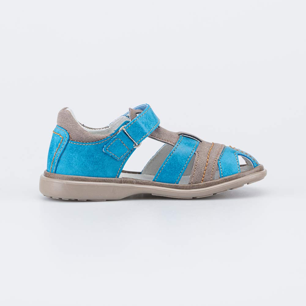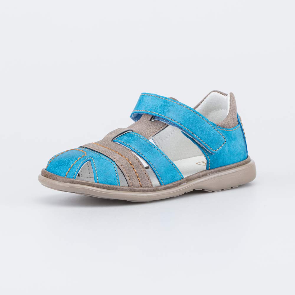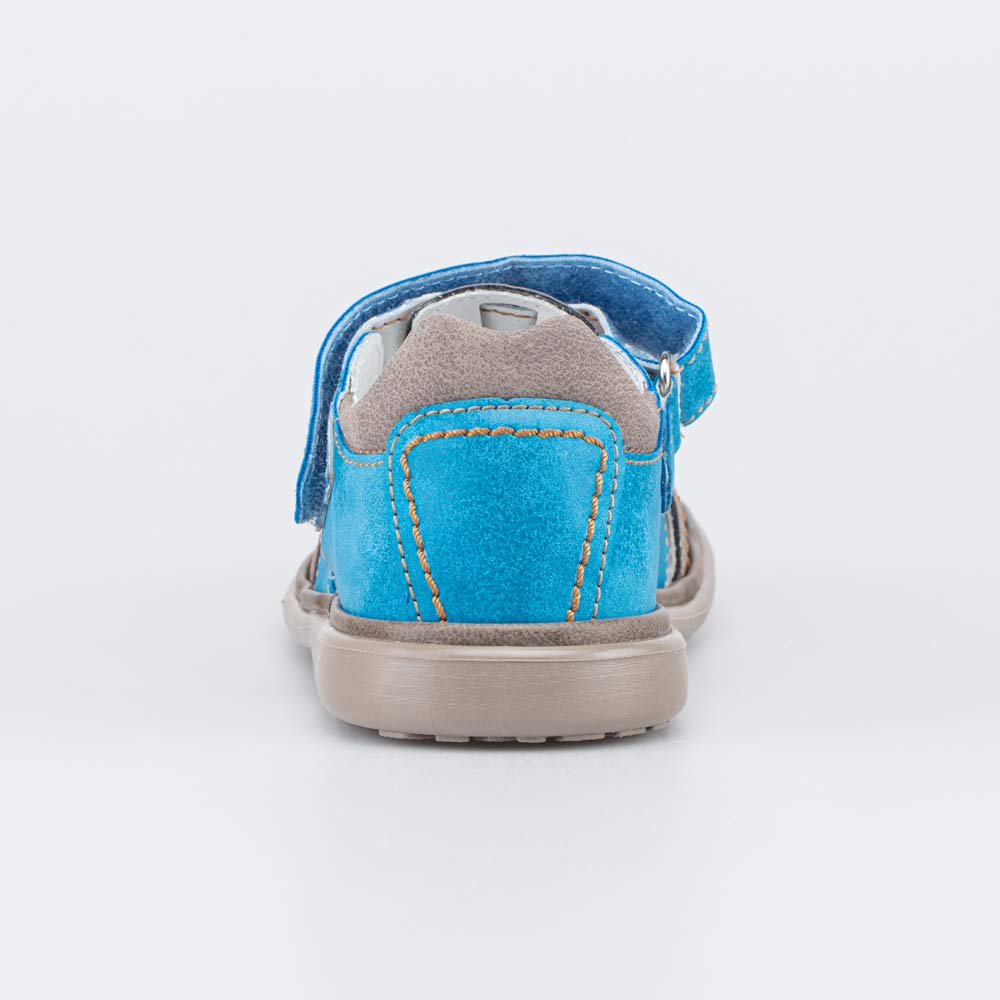 Верх голубых босоножек выполнен из высококачественной искусственной кожи. Закрытый носок защищает пальчики от возможных травм.