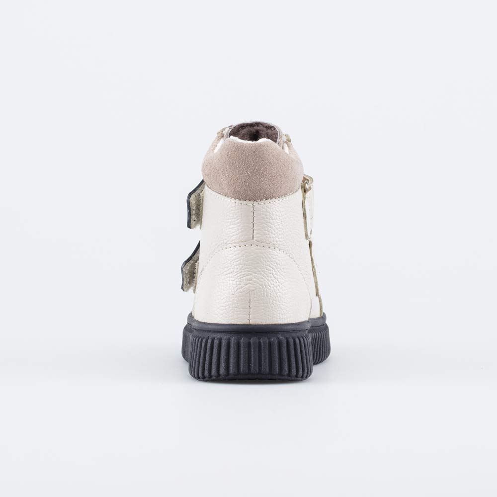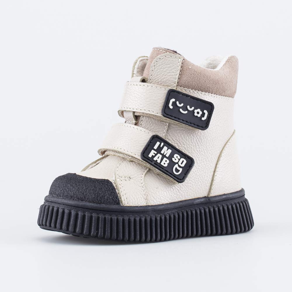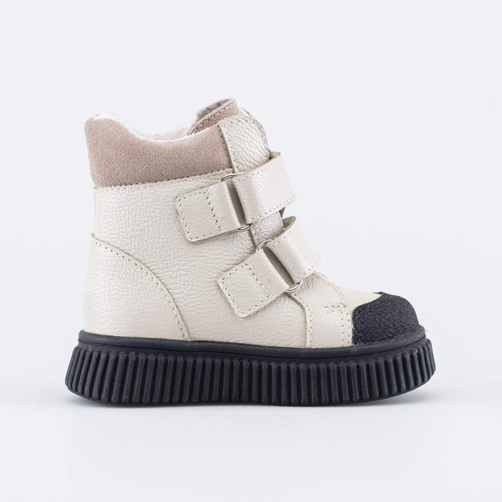 Верх этих детских ботинок изготовлен из натуральной гладкой кожи светло-бежевого цвета. Носочная часть усилена дополнительной кожаной накладкой с полиуретановым покрытием, выполненной в контрастном черном цвете. Она защищает обувь от повреждений.