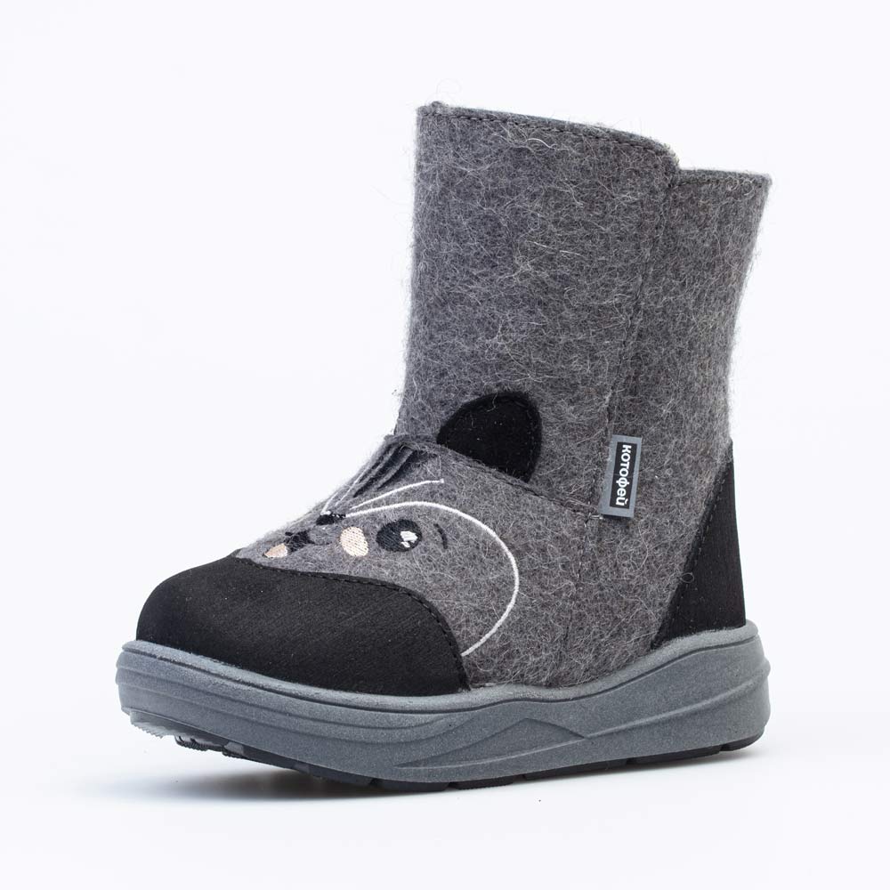 Детские валенки на подошве выполнены из натурального войлока и украшены вышивкой в виде мордочки котенка с озорными черными ушками.