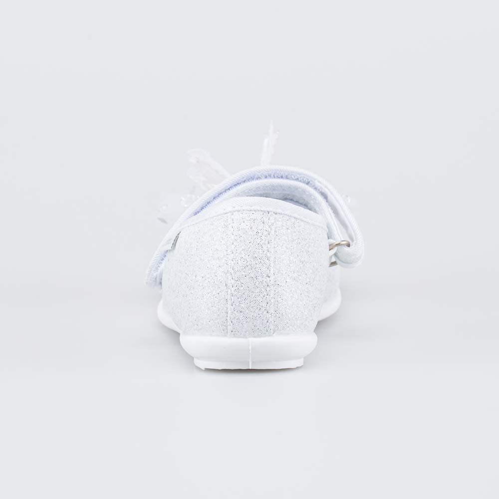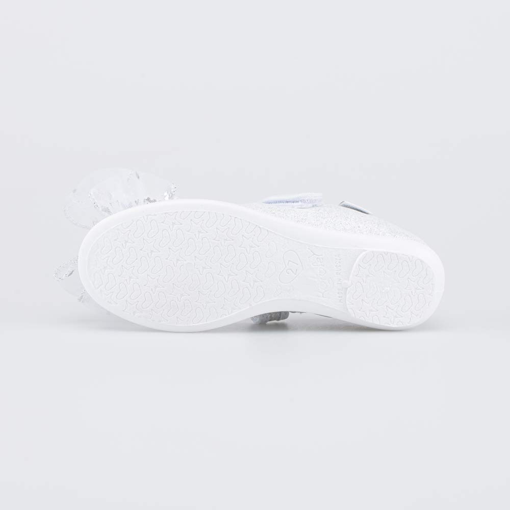 Верх этих серебристых туфелек выполнен из гипоаллергенного синтетического материала с эффектом блеска.