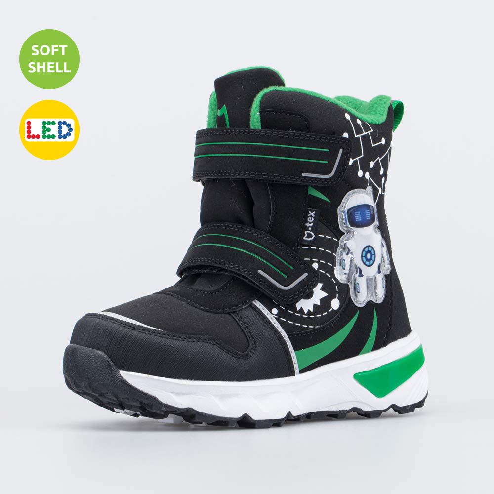 Мембранные ботинки с софтшелл выполнены из высокотехнологичных материалов и подходят для мальчика, который только начинает ходить.