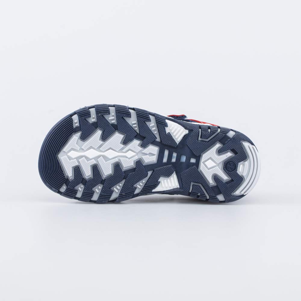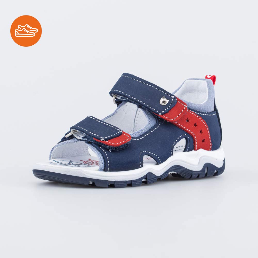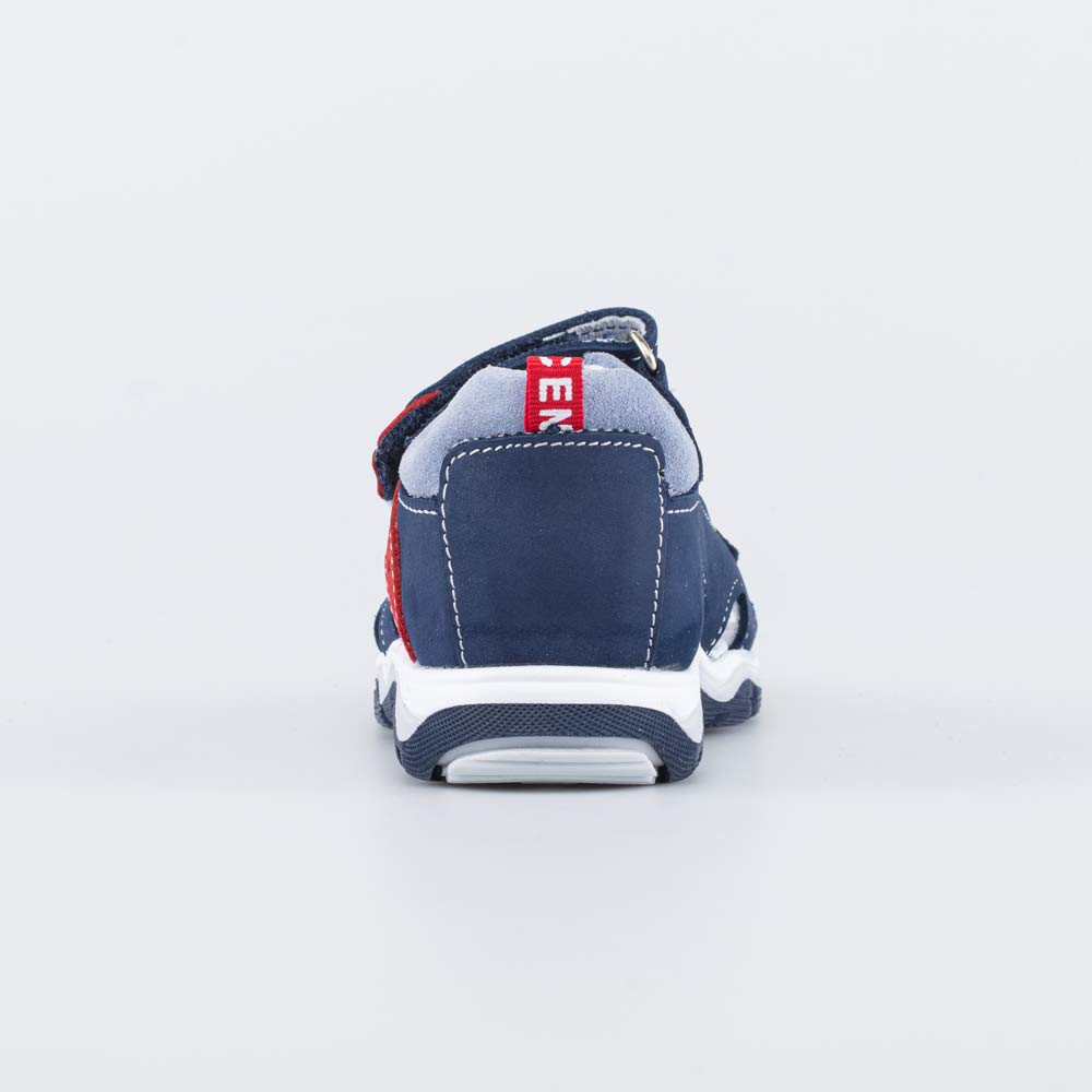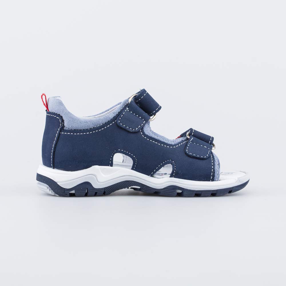 Сандалии, выполненные в синем цвете с акцентом на красный, отлично дополнят образ мальчика школьного возраста.