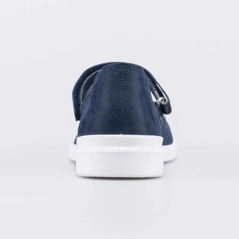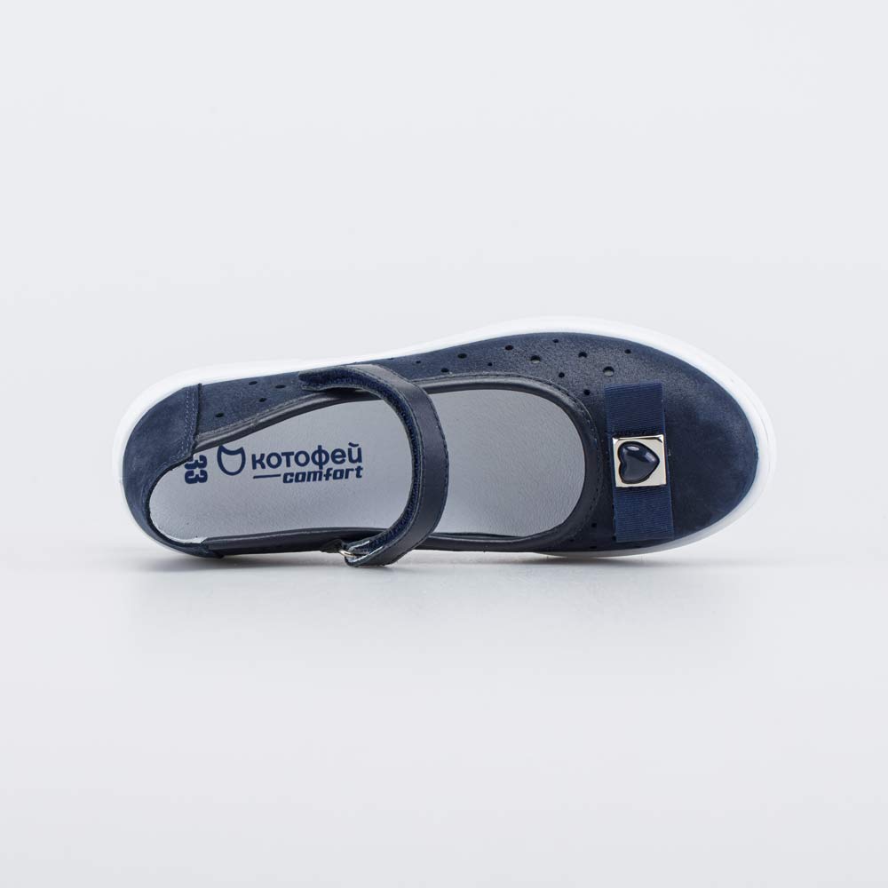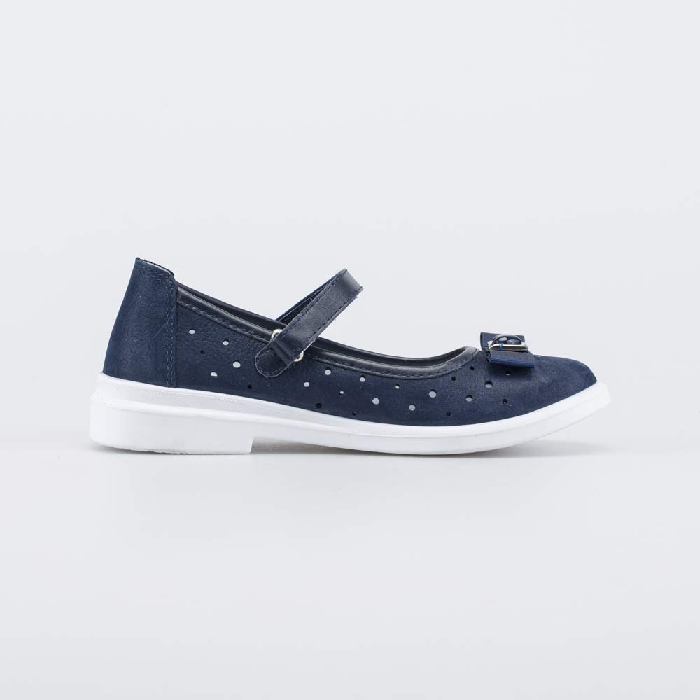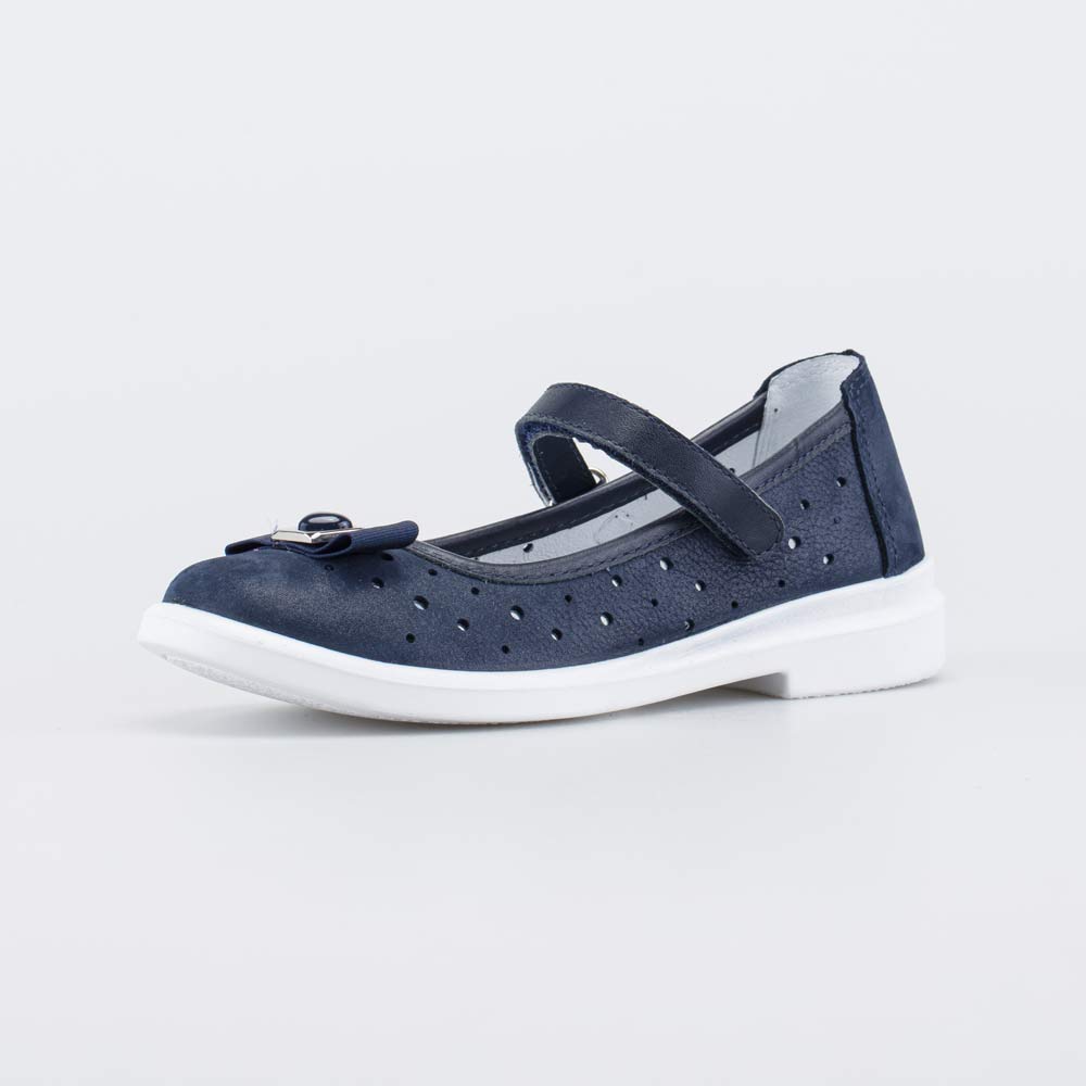 Школьные туфли имеют верх из гипоаллергенной и дышащей натуральной кожи синего цвета. Сквозная перфорация увеличивает воздухопроницаемость и обеспечивает комфорт даже при длительной носке. Бантик придает строгой школьной обуви кокетливый и романтичный внешний вид.