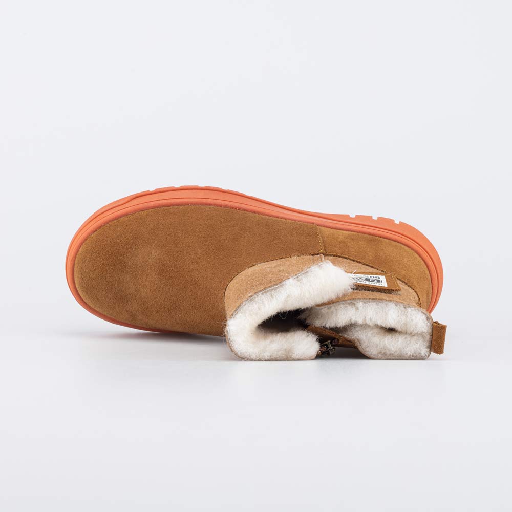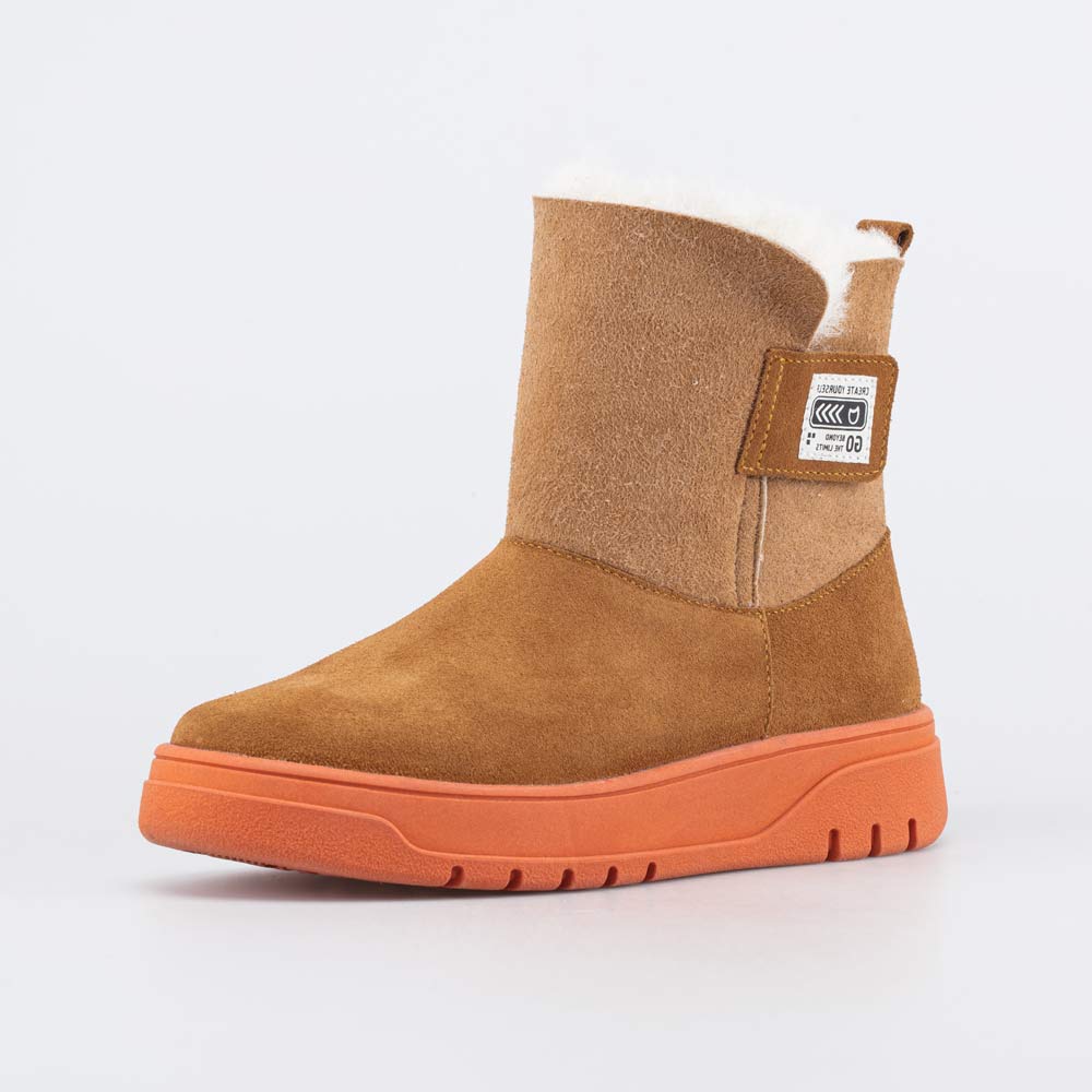 Зимние сапожки кирпичного цвета выполнены с применением технологии дабл-фейс (в районе голенища), когда натуральная овчина поворачивается мехом внутрь, к ножкам, кожей – наружу.