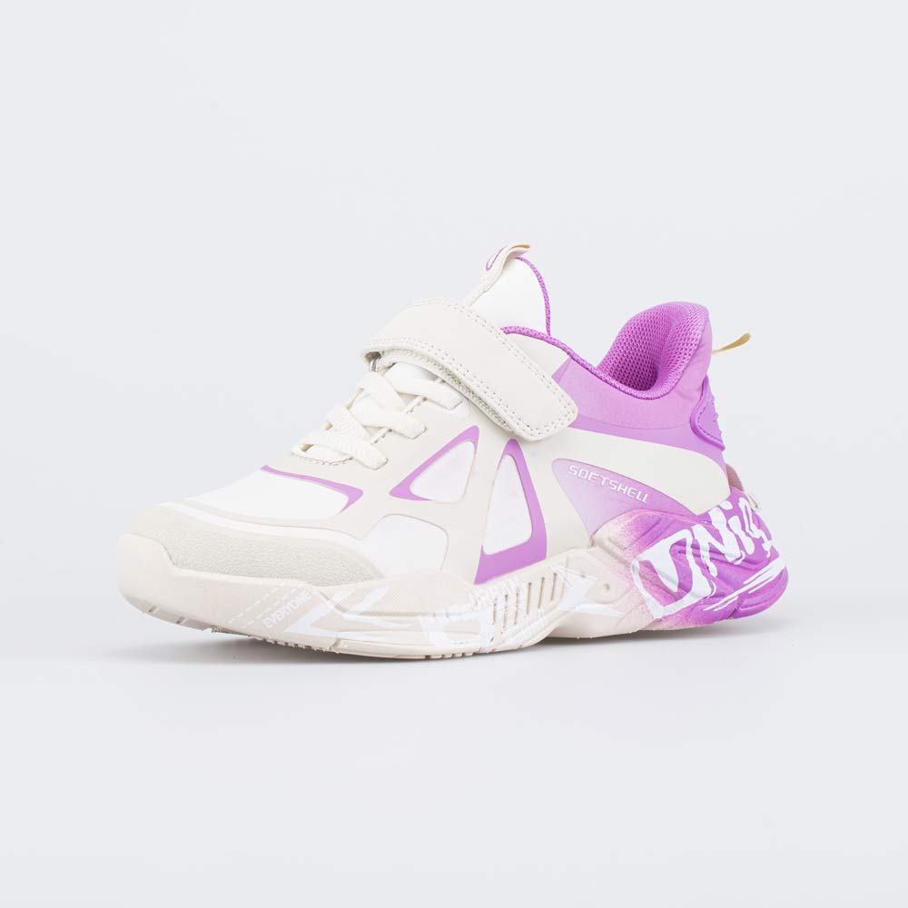 Бежевые кроссовки с элементами модного цвета цифровой лавандовый и верхом из материала софтшелл подходят для носки в весенне-осенний период, когда погода часто меняется и непредсказуема.