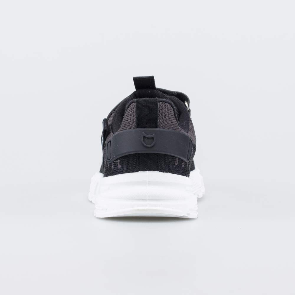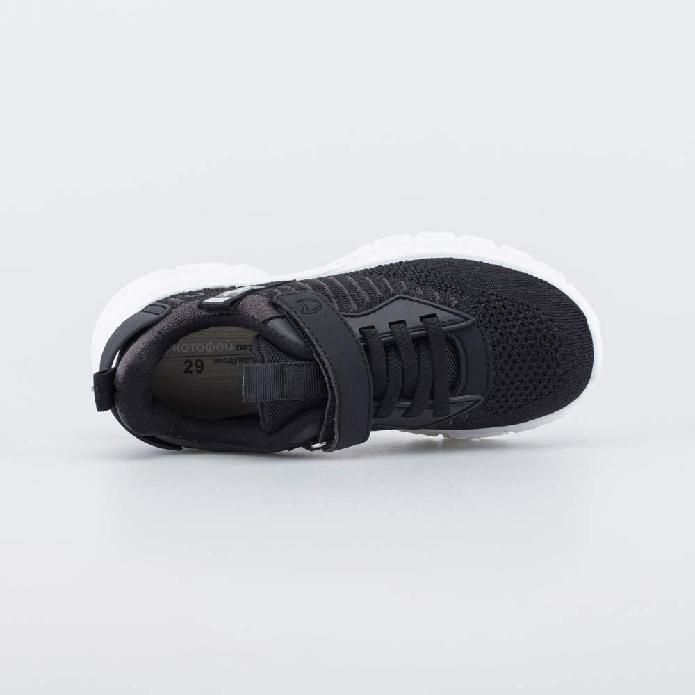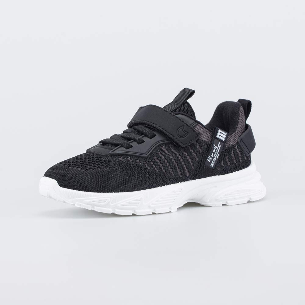 Верх черных кроссовок выполнен из вязаного текстиля, который обеспечивает высокую воздухопроницаемость и сохраняет комфорт внутри подростковой обуви даже при длительной носке.