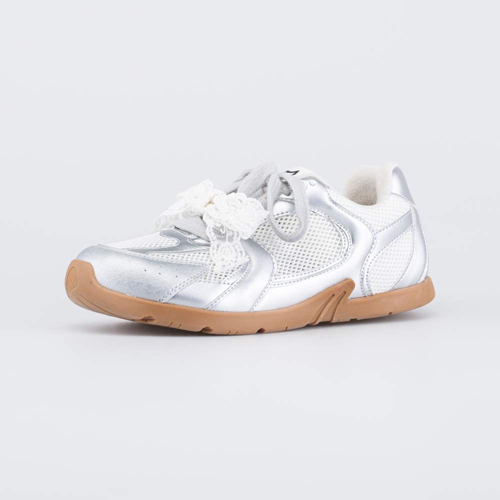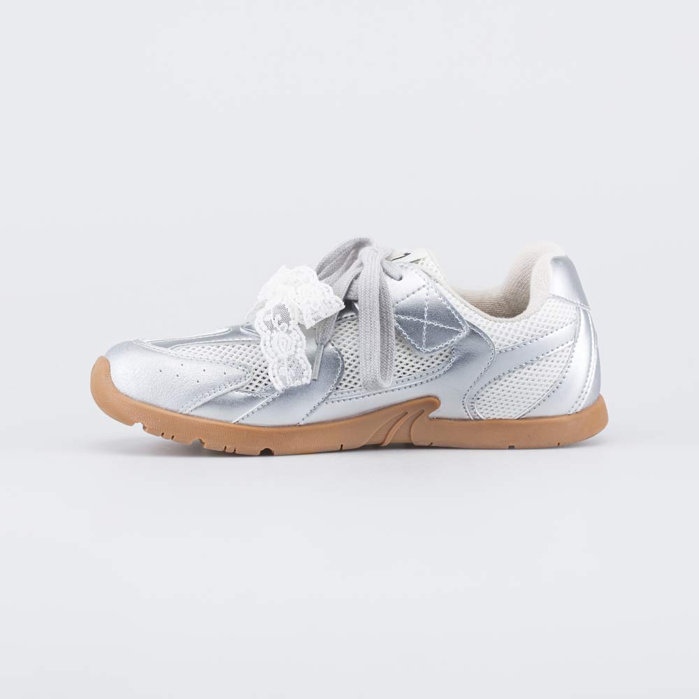 Серебристые кроссовки с бантиком представляют собой симбиоз современного стиля и комфорта.