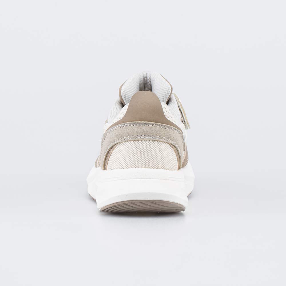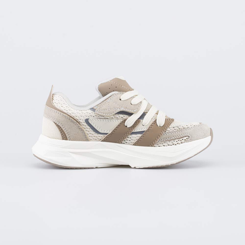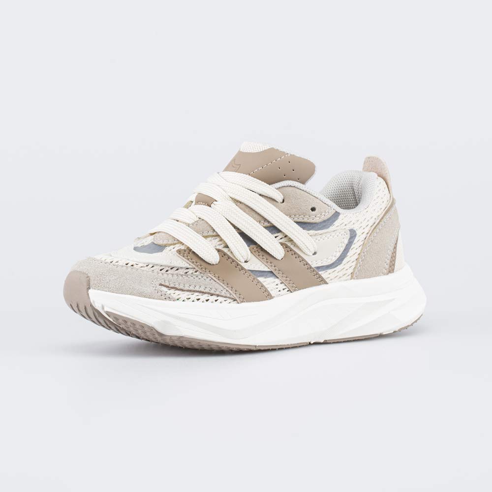 Верх бежевых кроссовок изготовлен из комбинации натуральной и искусственной кожи, а также вязаного текстиля, который образует сквозные отверстия для оптимальной вентиляции.