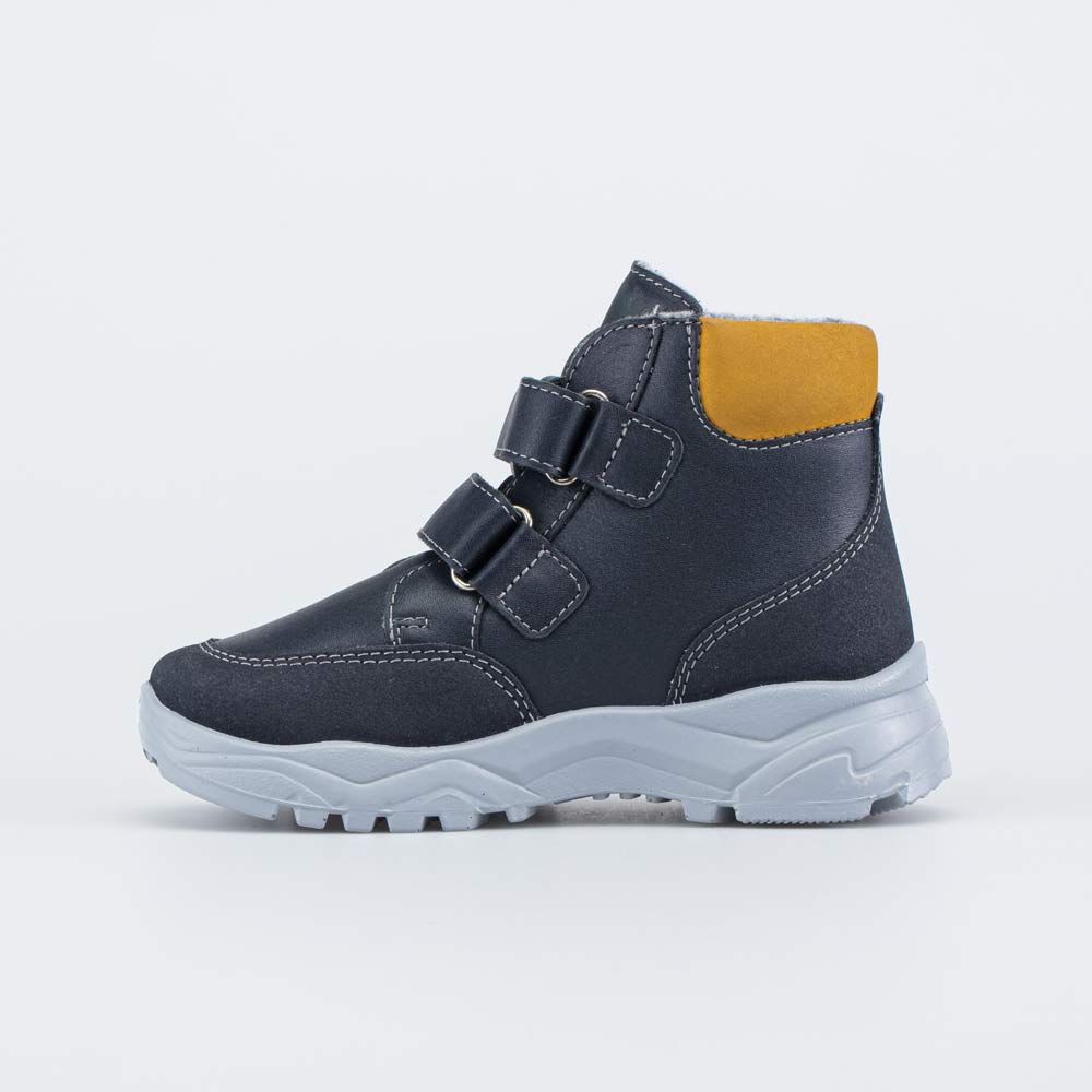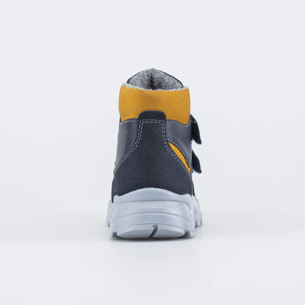 Верх выполнен из натуральной гладкой кожи темно-синего цвета, желтые акценты – из кожи-нубука.